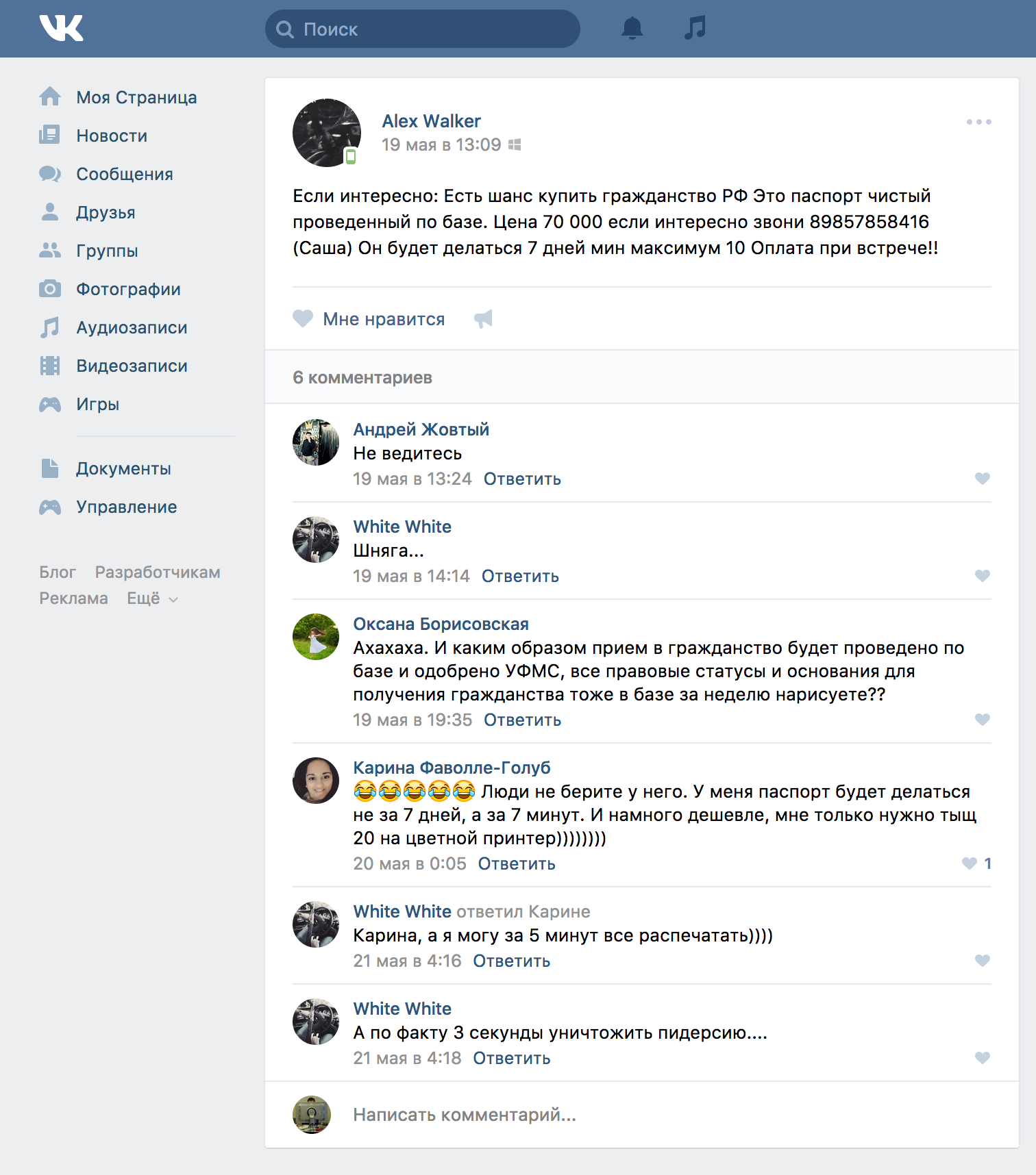 вот тут ссылка доступна только зарегистрированным этот профиль вконтакте продавал гражданство тут выше я прикреплял скриншот и ссылку, где он же уже пытается знакомится с телочками в Магадане ссылка доступна только зарегистрированным и там и там ссылки на один и тот же профиль фотка, которая есть ниже на странице про телочек с лицом, очень похожа на фотографию в профиле тут ссылка доступна только зарегистрированным где указано, что Влад из Запорожья и фамилия у него Безуглов (Vlad Bezuglov) кстати, ссылка на покупку гражданства оставлена им на стене группы "Украинцы в России и Москве" как-то слишком много подозрительных совпадений) проблемы у парня точно есть, но я бы с ним очень аккуратно общался. вдруг он еще чего намутить захочет. плюс в показаниях он путается - то из Москвы, то из Владивостока, то телефон такой, то другой. Падазрительно! Сообщение отредактировал DDimas - 26.9.2016, 17:46 |