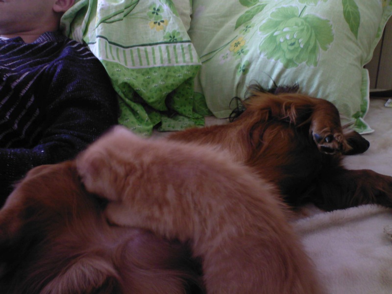 дубль 2. МОИ животные. Кот живет с нами. Собака, ввиду непереносимости его мужем у родителей. Зовут Мажор. Порода-такса длинношерстная. Офигенно добрая собака. Чего не скажешь о большинстве гладкошерстных родственников. На одной из фото, кот когда был котенком искал и пытался кормиться иж Жоркиной сиськи:)