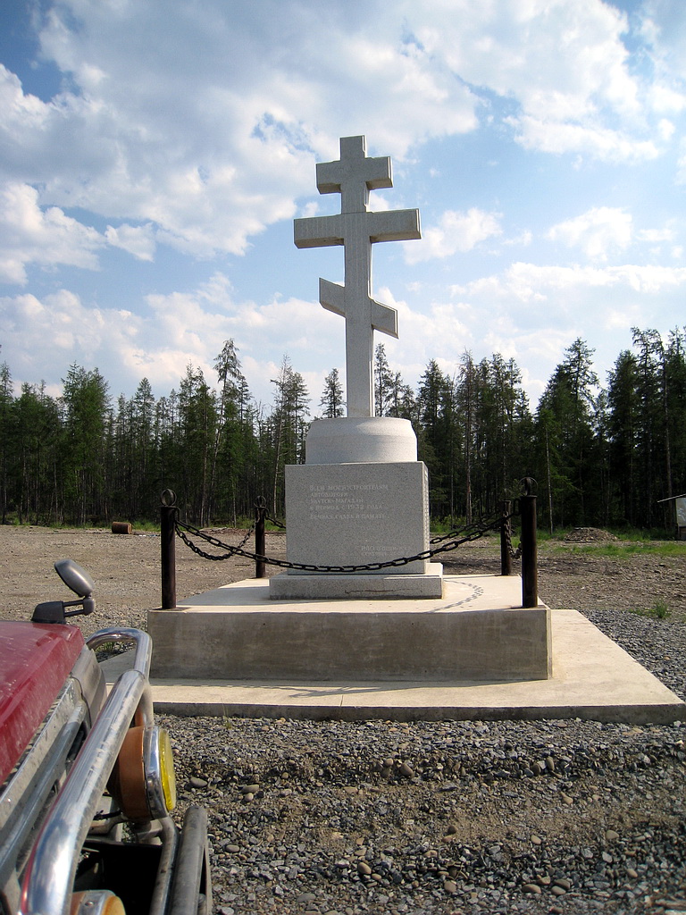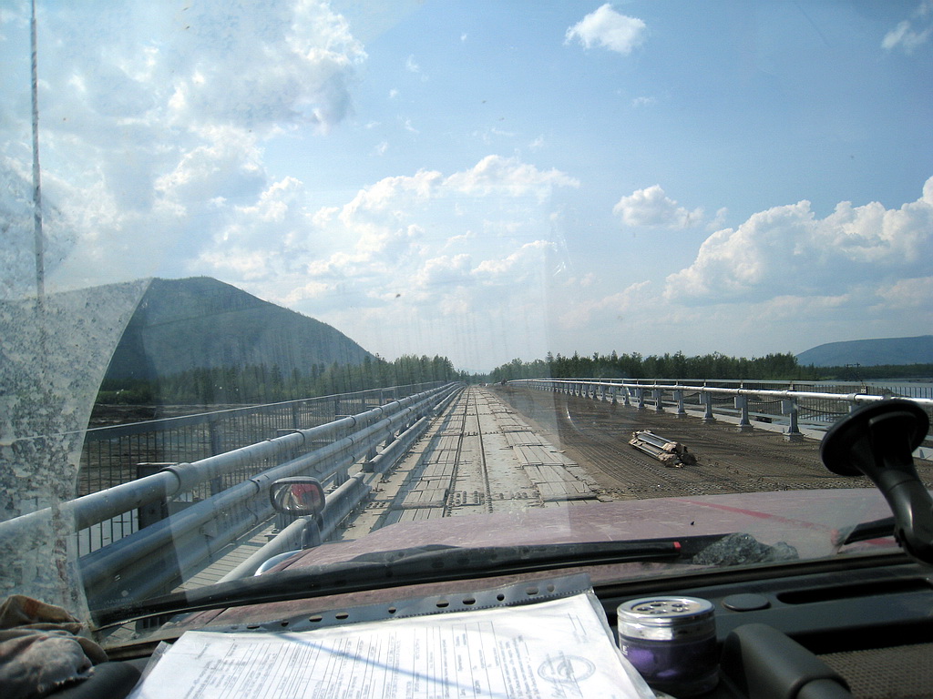 Продолжаем увлекательное путешествие по Федеральной трассе колыма: День третий. Усть-Нера – Кубюме. Проснулись в 9 по якутскому времени (напомню разница в час между Магаданом и Якутией). Попили кофе, собрались и пошли проверять машины (это уже стало ритуалом утренним – проверка масла, тосола, давления в шинах. Так как предполагалась дневка без магазинов- рядом затарились всем необходимым.. пока шла возня - супруга немного поснимала усть-Нерские гребни.. я таких мало где видел: Провозились долго…. Потом поехали заправились ( 50 литров по 36.50 т.е. на сумму в 1825 рублей) и покушать. Столовка паршивая в Усть-Нере... гадость.. но вроде съели... В общем кое-как выехали.. жара так же не спадала, было в районе 35… проехали мост через Индигирку и через 20 километров начали подниматься в перевал.. Причем никаких укзателей о том, что дальще перевал не было… я начал греться.. соответвенно на половине подъема остановился остывать… пока остывали.. мимо прошуршал камаз… ладно, остыли – поехали дальше. Перевал все выше.. обрывы все круче – подъем идет… Ну кое-как забрались… отдыхаем, остжаем машины.. народ пошел побродить по склону. Я остался возле машин… перевал огроменный конечно… сравнимый с нашим «Лошколахом» и Гаврюшкой…. На верхней точке подъема стоит какоето капище.. Водители оставляют жертву я так понимаю Мелочь в кармане была, так что я тоже приобщился к этому священодейству.. мало ли что. Кстати, перевал еще интересен тем, что на вершине он разделяется на два спуска.. дорога уходит по другому склону вниз в какой то якутский поселок. Ну а нам вниз.. дорога идет километров 15 с огромным количеством поворотов по склонам сопок. Понижается очень плавно.. но все когда нибудь проходит… так и мы прошли спуск с перевала, переехали через три моста крайне подозрительного вида и… вышли на какую-то совершенно сказачную трассу. В жизни таких грунтовок не видел. GPS гордо показала, что еду я по сплошной тундре и дорог здесь отродясь не было. Тем не менее ни подвеска авто, ни глаза меня обмануть не могли. Так вот какую нам дорогу построил «Стройгазконсалтинг». Скорость движения сразу возросла с 60-70 до 100-110 км в час. Одна мысль не давала покая – сколько такая радость продлиться… Через 10 минут проехал городок строителей моста через р.Эльга: Надо сказать что – этот мост оставался последней преградой для движения из Магадана и в Магадан. В прошлом году его еще не было – стояла только одна опора.. В этом году – мост почти готов… Как видно на фото – когда мы ехали туда.. на одну половину моста укладывали сетку рабицу – другую обложили досками для беспрепятственного проезда автомобилей.. красота. После моста – хорошей дороги было еще где то километров 80 – пролетели их за меньше чем час…. А вот конец этой насыпанной мини-федералки (как мы обозвали ее на обратном пути) был еще не закончен – голая крупная отсыпка… дырдырдыр – кричала подвеска на скоросте в 30 км в час…. На такой скорости – комфортно пить кофе кстати, на ходу не останавливаясь.. что мы и делали… дорога закончилась подъемом в брюнгадинский перевал.. Это самый идеально сдлеанный перевал на всем пути моего следования.. он был отсыпан какиме то очень мелкими камушками но ровными – один к одному и потому без ямок, без тряски, машина по нему просто летела!!!! После моста через Брюнгдае – стоит вот такой замечательный кре