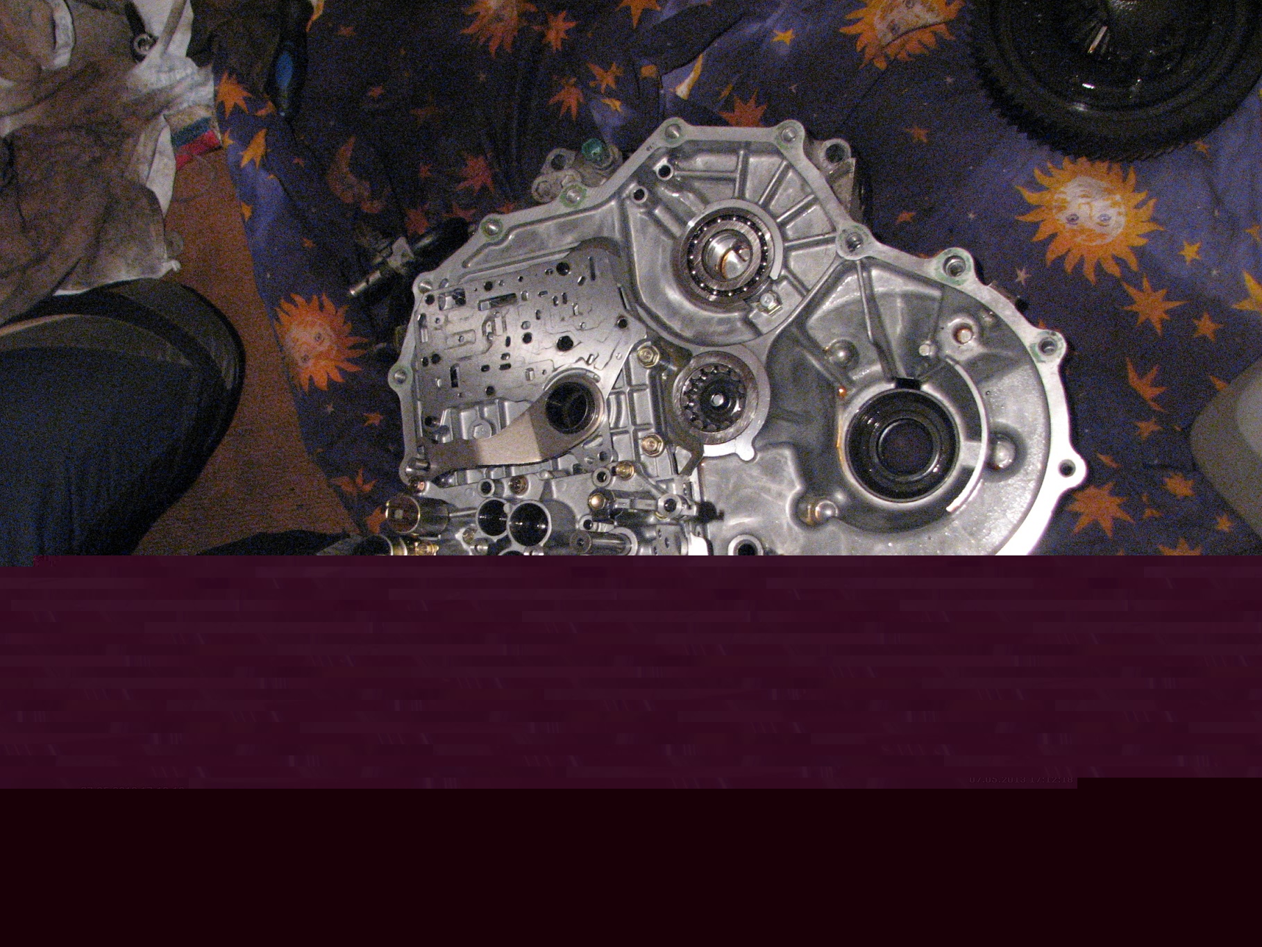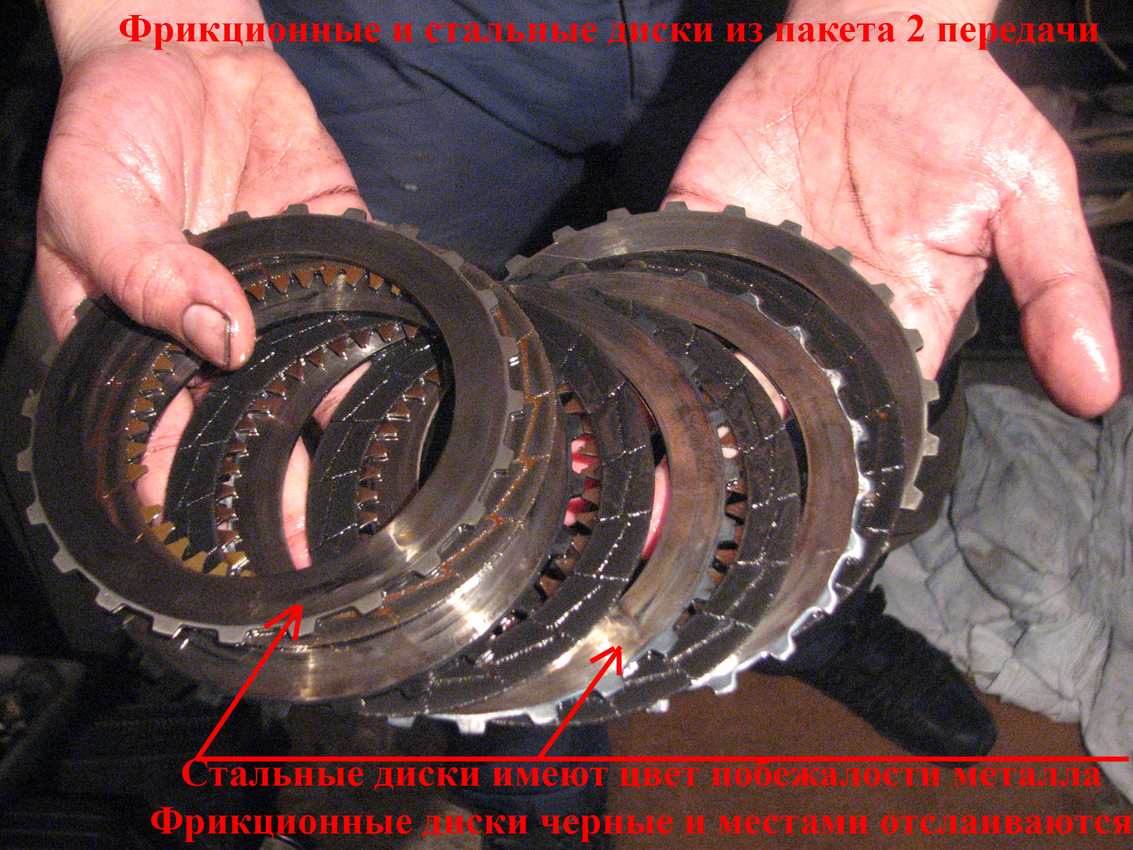оригинал тут ссылка доступна только зарегистрированным фотографии сейчас мною скачиваются, как сольются - выложу аттаченый архив, уж больно они большого разрешения чтобы пихать их в галерею. ================================================================================ = Всем доброго времени! Начну с предистории. Давненько тут на форуме общались по поводу замены масла на стенде(типа 100%) ссылка доступна только зарегистрированным . Я поменял на стенде, уважаемый man-at-work говорил что не стоит этого делать, мы спорили :smile3: Я утверждал что ничего страшного, он обратное. Снимаю шляпу перед ним, все что он и говорил случилос.... коробка умерла. Как-то осенью хорошенько пооджигав, заметил что при переключении с 1 передачи на 2 происходит пробуксовка (причем только на высоких оборотах). ну чтож смирился - ездил как пенсионер(в таком случае пробуксовка меня не напрягала). Так проездил еще пару месяцев... потом по ощющениям пока едешь плавно газ не давишь машина разгоняется, но стоит резко нажать на педаль - обороты прыгают, а машина не ускоряется.... Однажды решил продемонстрировать данную проблему моему другу. Нажал в пол- а машина еле-еле едет, остановился на светофоре и больше тронуться не смог..... коробка померла Съездил в специализорованный сервис кто занимается ремонтом коробок узнать сколько будет стоить ремонт. Мне озвучили цифру около 50т.р. (со словами что от коробки моей останется только корпус - я подверг сомнению данное утверждение. Потому что если посчитать все НОВЫЕ запчасти для коробки выйдет больше 100т.р). и не понравилось отношение. Контрактную коробку предложили мне за 45т.р. (но это кот в мешке - гарантий того что мне не придется ее заменить даже через месяц нет) Я решился делать сам (опыта раньше не имел никакого). Сразу прошу прощения у бывалых критиков я не мастер писать отчеты и т.п. но все же хочу поделиться. ногами не пинать :smile3: Описывать съем коробки не стану так как это действительно большой геморой! (пусть снимают в сервисе - это стоит своих денег). У меня небыло лебедки чтоб вывесить коробку за уши - кто знает тот поймет что это значит. Снимал с помощью 4х домкратов сначала подрамник, подвеску переднюю, привода, потом коробку (сломал фишку соленоида линейного давления (смог все спаять - но это отдельная история)) Снял коробку, слил масло из коробки и гидротрансформатора (бублик в простонародье) - откачивал шприцем. В масле ничего не обнаружилось ни трухи, ни металической стружки, только сгоревшее черное масло. Внешний осмотр показал что трансформатор в порядке, цвета побежалости металла небыло (от перегрева металл синеет) - отставил в сторону. Начался разбор коробки, снял торцевую крышку пластиковую, под ним разъем к датчику положения(ингибитор если не ошибаюсь). Снимаем разьем, снимаем датчик положения. (На этом этапе фоток небыло). Откручиваем крышку на 10 болтах и видим: [ATTACH]23704[/ATTACH] Снимаем шестерни(парковочную - левая резьба, и шестерню первичного вала), снимаем парковочную собачку, выставляем рычаг переключения с прорезью на корпусе, разжимаем стопорное кольцо вторичного вала (иначе не снимется корпус.) Снимаем крышку соленоидов, снимаем проводку поленоидов и главный клемник. [ATTACH]23714[/ATTACH] Откручиваем 19 болтов по периметру корпуса и снимаем корпус (снимается он с усилием) и дальше видим: [ATTACH]23710[/ATTACH] C промежуточного вала снимаем шестерню, вилку включения задней п