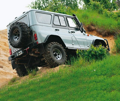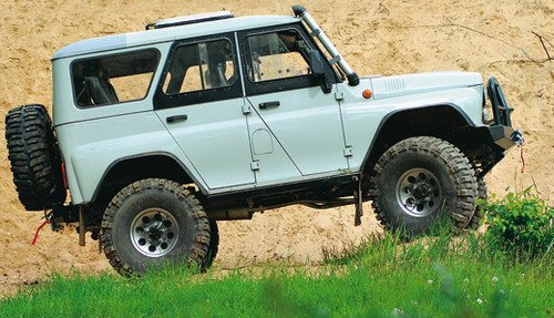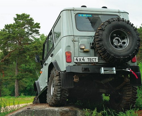 Автомобиль предполагалось использовать на дороге и бездорожье – не для спорта, но для охотничье-рыболовных забав. Такой развлекательно-оздоровительный вариант. Лифт подвески – проставки под кронштейнами серег рессор. Это грамотнее, чем длинные серьги, – управляемость здесь и так не очень, зачем ее дальше ухудшать. Лифт кузова на 100 мм реализован, естественно, с помощью проставок. Итог – колеса SuperSwamper Bogger диаметром 37 дюймов. Мосты портальные. Угол продольного наклона шкворня увеличили на 6 градусов, что прибавило курсовой устойчивости. Блокировки нижегородского производства довели до ума, добавив им работоспособности. Еще: силовой обвес, лебедки спереди и сзади, пол обработан противошумной изоляцией и закрыт рифленым алюминием – стандартный тюнинг «УАЗа». Расширители на два с четвертью дюйма. Шноркель вполне утилитарного вида и дизайна – прочный, дешевый, эффективный. Карбюраторный мотор заменили современным инжекторным, ульяновского же производства. Добавили отопитель задней части салона и подогрев сидений. Очень удобен люк от автобуса «ПАЗ» – можно приоткрыть для проветривания, можно откинуть для стрельбы или фотосъемки. Бортик по краю не даст затечь воде. Cамое же главное – автоматическая подкачка колес, новая разработка фирмы. Справа от остальных приборов поселился манометр, а спереди перед рычагами КПП и РК – краники. Можно, не выходя из салона, замерить давление в любом из колес, подкачать их – каждое в отдельности или все сразу. Еще одна важная мера для повышения проходимости – увеличенное с 1.98 до 2.98 понижение в раздаточной коробке. НЕ СПАСАЕТ ПОНИЖЕНИЕ Стоит ли удивляться, что мне нетерпелось опробовать этот замечательный аппарат. Мы выдвинулись на нем в сторону небольшого прудика невдалеке от мастерских. Сдвоенные амортизаторы заставили работать подвеску, машина не прыгала! Затем нам путь преградили бетонный блок и вбитые штыри. Так, слегка приспустив шинки, пытаемся перелезть через блок с краешку. Не выходит! И увеличенное понижение в РК не спасает – не едет на низах даже инжекторный «УАЗ». Пришлось газануть. Четыре Bogger’а, провернувшись, выплюнули по кубометру грунта. «Уазик» двинулся на полметра вниз. И сел на порог. Приехали... Зато в грязи и колее на нем будет хорошо, если ехать немного ходом. В общем, приятно удивил меня «УАЗ». |