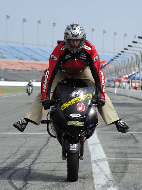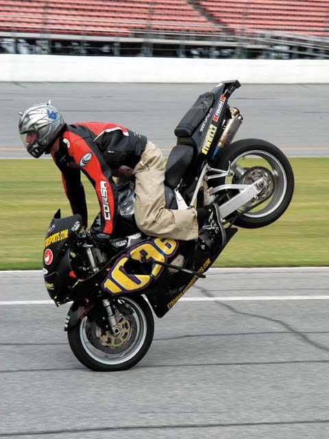 Свое название этот экстремальный вид спорта получил от английских слов — stunt (в переводе «трюк») и ride («езда»). Считается, что стантрайдеры впервые появились в Англии в 80-х годах ХХ века. Хотя если подумать то как только переднее колесо мотоцикла впервые оторвалось от земли, в этот момент и родился стантрайдинг.. И так стантрайдинг это трюковая езда на мотоцикле, понятие конечно довольно широкое, но стант и есть вид спорта без ограничен практически. Единственное неверно можно провести линию между мото фристайлом и стантрайдингом. Во фристайле все самое интересное происходит в воздухе , в то время как в станте вообше не используется никаких дополнительных приспособлений, ни трамплинов ни рамп, только ты твой мотоцикл и дорога, следовательно стантрайдингом можно заниматься где угодно и даже не важно есть ли там асфальт.. Тип мотоцикла также не принципиален, можно использовать любой, который есть под руками, люди даже на скутерах гоняют.. Ну единственное только чепер наверное не подойдет, хотя можно конечно попробовать управляемый занос. Но профессионалы обычно отдают предпочтение 600 кубовым спортбайкам, во первых у них наиболее удачное для стантрайдинга соотношение мощности и веса, во вторых выглядят они и звучат более эффектно чем например эндуро. Хотя сам стантрайдинг появился за долго до того, как было придумано это слово выделять его в отдельный вид спорта стали сравнительно недавно. В начале 1990-х годов прошел первый чемпионат мира по стантрайдингу. Его участники демонстрировали самые непредсказуемые приемы вождения мотоцикла. К примеру, Крейг Джонс – первый, кто «сел на руль» (залез на бензобак), перекинув ноги через руль и поехав на заднем колесе. В стантрайдинге, как и в фигурном катании, большую важность и почетность имеют новые элементы, нежели повторение старых, так как набор возможностей ограничен — ведь у мотоцикла лишь два колеса. Трюки на мотоциклах со временем все больше усложнялись. Говорят, что настоящая трюковая езда началась, когда стантрайдеры перестали пользоваться ручкой газа, другими словами «накручивали» холостые обороты, придерживая мотоцикл лишь с помощью тормоза. Так райдеры получили возможность ездить на мотоцикле без помощи рук. Первым, кто это сделал, был бразилец А.К. Фариаш, ставший чемпионом мира по стантрайдингу. Новые трюки придумываются людьми по всему миру постоянно но за частую это уже просто комбинация нескольких трюков придуманных раньше, это не делает их проще, даже наоборот, начинающим райдерам становится все сложнее влиться в эту струю, трюки становятся все сложнее и опаснее, и чем то простым уже никого не удивишь, а учится все равно приходится начиная с простого.. Несколько трюков для начала... Wheelie (вилли) или Руководство по езде на заднем колесе Источник: www.stuntlife.com Для начала необходимо сказать, что всё изложенное здесь является моим личным опытом и опытом других моих знакомых стантрайдеров. Следование следующим советам не поможет вам избежать падений, вывихов, растяжений или даже переломов, но все таки это будет более безопасно, чем если бы вы обучались этому сами. Подготовка байка к езде на заднем колесе. Масло: Много байков страдает масляным голоданием при длительных прохватах на заднем колесе и постановке байка на 12 часов с заведенным двигателем.. Особенно известны этим Джикс