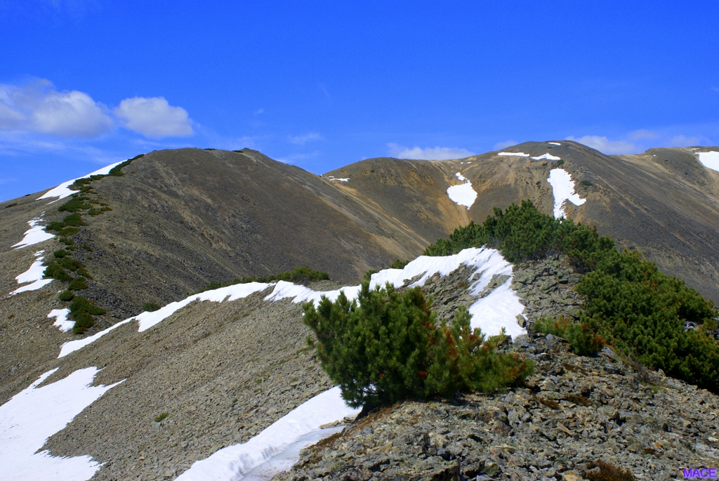 Ручьи переходить не пришлось. Всю дорогу сухо. Подъём постепенный, во многих местах можно идти по старым бульдозерным колеям, без значительных перепадов. Крутой склон был только в одном месте. Большую часть прошли по вершинам и гребням. Чего и вам желаю. Аккуратно на склонах-местами камни "плывут". Камнеупорная обувь - обязательна, а так же бутылки для питьевой воды. речка при входе. вверху - снежники. ждя перекуса по дороге лучше взять термосы, с дровами наверху проблема. 10-го будем так же в районе Карамкена. вероятно пересечёмся. Вперёд, по гребню козьими тропами (то есть бараньими) В самых тихих местах - уже цветение. Вот она! обратный путь был тоже по гребню. ноне у всех. нам нужно было забрать ставшие лишними и оставленные на подъёме резиновые сапоги, а часть группы спустилась по распадку до старой дороги - и к трассе, где и была подобрана позже. скоростной спуск на попах и рюкзаках - быстро, весело, мокро -------------------- Для бешеной собаки пятнадцать километров - не крюк...