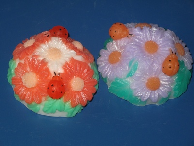 Мыло с маслом виноградной косточки или макадами. Отдушки: сирень пахнет сиренью, нарцисс - свежескошенной травой и утренним лесом, малыш в капусте - огурцом, шкатулка - Ямайка, ландыши - ландышами,клумба -букетом и лавандой. Барашки - бамбук и конопля, Calvin Klein и Hugo Boss.