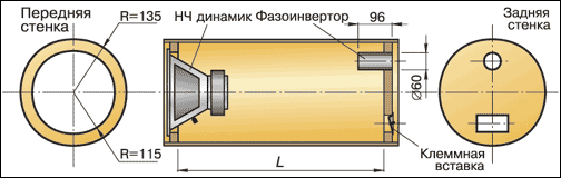 Рисунок 1. Низкочастотный динамик ALTRONIX E-RSW1039A Но сначала пришлось заняться изготовлением корпуса акустической системы типа "закрытый ящик" с фазоинвертором (см. рис. 2). Рисунок 2. Конструкция корпуса акустического агрегата закрытого типа с фазоинвертором Полезный объем корпуса V, диаметр d, длину l трубы фазоинвертора и другие параметры рассчитал на компьютере с помощью программы JBL SpeakerShop. Все эти расчеты программа выполняет исходя из характеристик используемого динамика (полной добротности Qts, резонансной частоты Fs, эквивалентного объема Vas и т.д.). В моем случае получилось: d=60 мм, l=96 мм. Для динамиков другого типа эти параметры будут, естественно, другими, и в конструкцию акустического агрегата необходимо внести соответствующие изменения. Проще всего в домашних условиях сделать корпус для сабвуфера в виде круглого бочонка, у которого динамик встроен в одно из донышек (см. рисунок). При этом оба донышка можно вырезать электролобзиком из ДСП или многослойной фанеры (рис. 3), а цилиндрический корпус согнуть из листа ДВП. Рисунок 3. Оба круглых донышка корпуса выпилены лобзиком из ДСП Сначала я сомневался в прочности такой конструкции и предполагал наклеить два слоя, но после завершения сборки все мои сомнения развеялись, так как корпус получился очень жестким и с ДВП в один слой. Согнуть же заготовку из листа ДВП в цилиндр оказалось довольно просто. Для этого ее достаточно распарить с внешней стороны, проглаживая утюгом через мокрую тяпку. После того как лист ДВП был согнут, круглые донышки я вклеил ПВА и дополнительно закрепил скобками с помощью строительного степлера. Готовый корпус с внешней стороны обшил ковролином (наклеил и закрепил скобами) (рис. 4). Рисунок 4. Готовый корпус обшивается ковролином В заключение вклеил трубу фазоинвертора, закрепил на задней панели вставку с клеммами для подключения, подпаял провода и установил на место динамик. Все получилось очень неплохо (рис. 5). Рисунок 5. Акустический агрегат в собранном виде Со сборкой электроники никаких проблем не возникло. В оба набора вложены довольно подробные и понятные инструкции, по которым все можно собрать и подключить легко и просто (рис. 6). Рисунок 6. Со сборкой электроники из наборов МАСТЕР КИТ не возникло никаких проблем Единственное, что сделал не по инструкции - вместо рекомендованного для микросхемы усилителя мощности радиатора площадью 600 см2 установил радиатор центрального процессора (разъем Socket 370) с вентилятором, оставшимся после модернизации компьютера. Замена оказалась вполне приемлемой. И, наконец, электронику я специально вынес в отдельный корпус, хотя рациональнее было бы поместить ее в корпусе акустического агрегата, выгородив для этого специальный отсек. Но мне очень хотелось самому "покрутить" все эти ручки и настроить сабвуфер непосредственно в салоне автомобиля при прослушивании реальной "музыки" . Поэтому собранный усилитель я разместил в перчаточном боксе (рис. 7), а на его лицевую панель дополнительно установил отдельный выключатель питания. Рисунок 7. Электронный блок сабвуфера установлен в перчаточном боксе, называемом в просторечье "бардачком" Звучит стереосистема с самодельным сабвуфером ничуть не хуже, чем с фирменным, а стоит в несколько раз дешевле. Но главное в том, что мне удалось это сделать своими руками. К сожалению я не помню 
