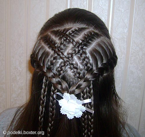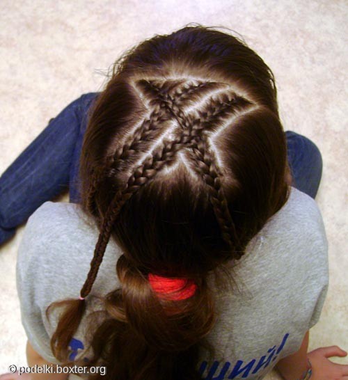 Наши модницы плетут не одну, не две, а много косичек. Это и просто заплетённые волосы, и украшенные бусинами, ленточками, верёвочками, цветами и всем, всем, всем. Причёска из косичек идёт всем без исключения: и взрослым девушкам, и самым юным красавицам. Причёска "Римская сеточка" 1. Горизонтальным пробором разделить волосы на две части (верхнюю и нижнюю). Нижнюю завязываем в хвост, чтобы не мешала. На верхней части будем делать плетение. 2. Отделяем прядь волос с небольшим наклоном в сторону. Плетем французскую косу, забирая волосы с двух сторон. 3. Отделяем вторую прядь крест на крест к первой. Выполняем плетение французской косы. 4. Аналогично выполняем еще по одной косичке с правой и левой стороны. 5. Оставшиеся волосы заплетаем в более крупные косы, соединяем вместе резиночкой и украшаем заколкой. -------------------- Стерилизуйте дворовых и домашних любимцев!