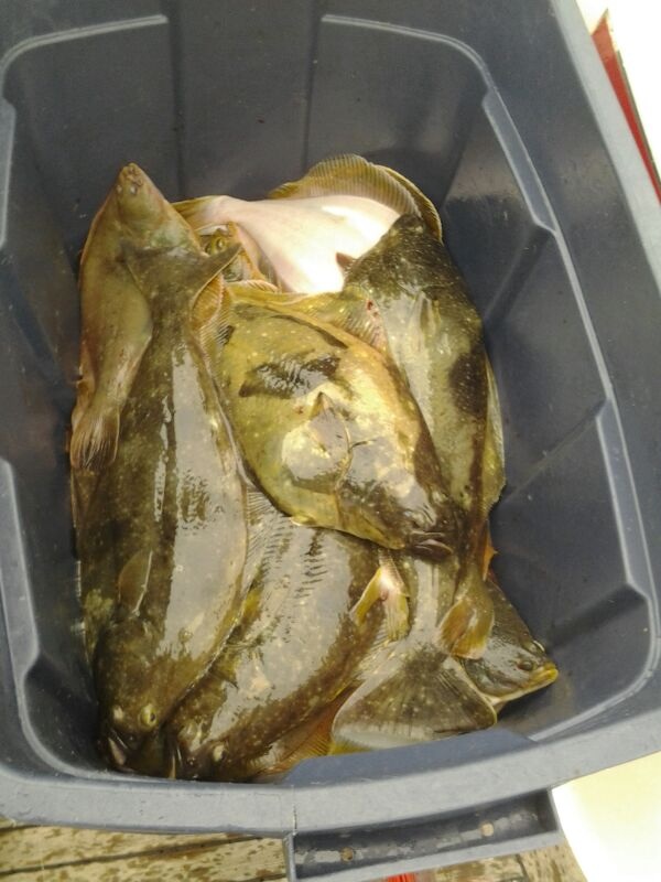 Сегодня на Светлой палтус-10 и камбала,дочь первый раз в море первая сразу два палтуса вытянула