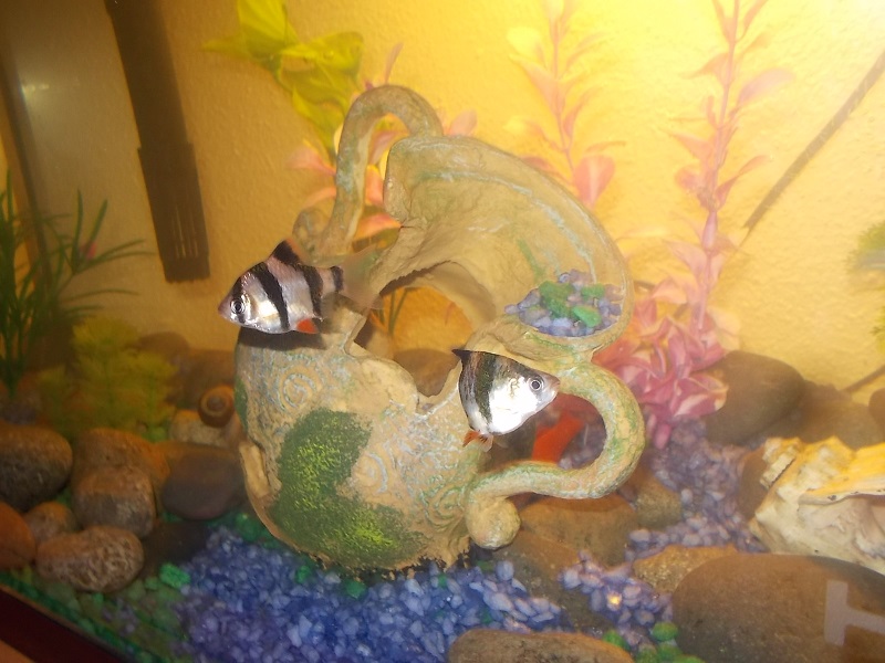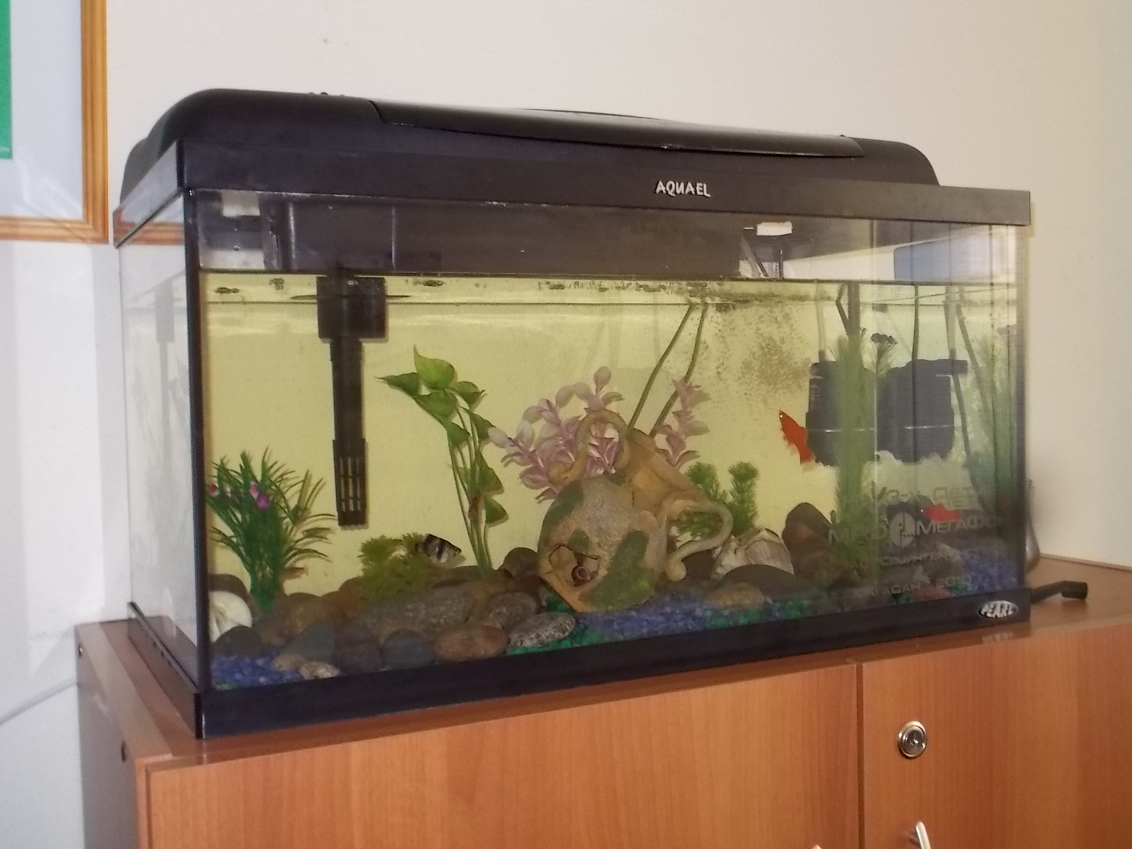 Организовал на работе аквариум! Вернее он был,но прежние обитатели (шпорцевые лягушки) не вызывали никакой симпатии у сотрудников,и я воспользовавшись моментом переделал его внутренний мир,совместив в нем еще и корпоративные цвета. )) Итак. Грунт магазинный(зеленый и фиолетовый),камни местные, сам выбирал кругленькие из кучи ПГСа, растения все искусственные,фильтр проточный, интегрированный в крышку аквариума (кассетного типа,-две с губками,одна с грунтом),аэратор AQUAEL,вода водопроводная, отфильтрованная. Население Неоночки-6 шт. Меченосцы-2 шт. Попугаи- 2 шт. Барбусы полосатые -2шт. Сомик- 1 шт. Улитки -5 шт.