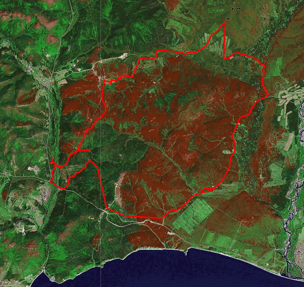 Прошли в субботу втроем по кругу вокруг массива г. Англия от ГАИ, по верхам вышли между Лесной Школой и Орбитой, по полям на Ланкучане в сторону озер на тундре, потом за р. Сердях, клепкинская трасса и по "новой" ЛЭП выскочили через Ольский перевал на дачи. От Пионерного получилось 112 км.