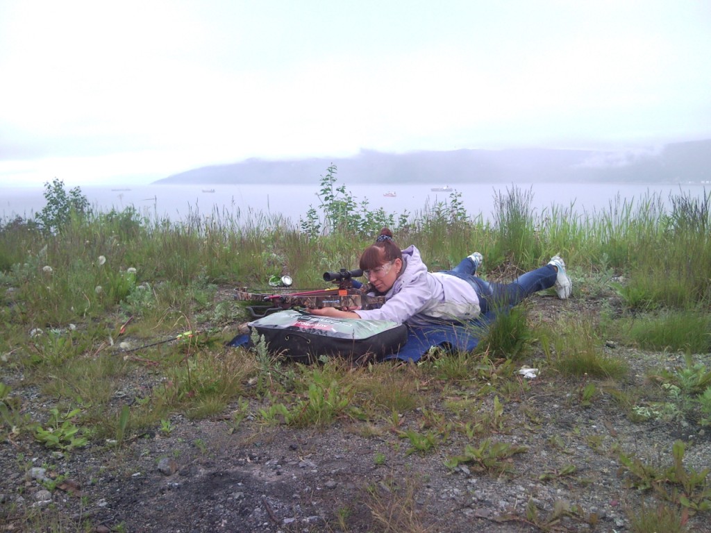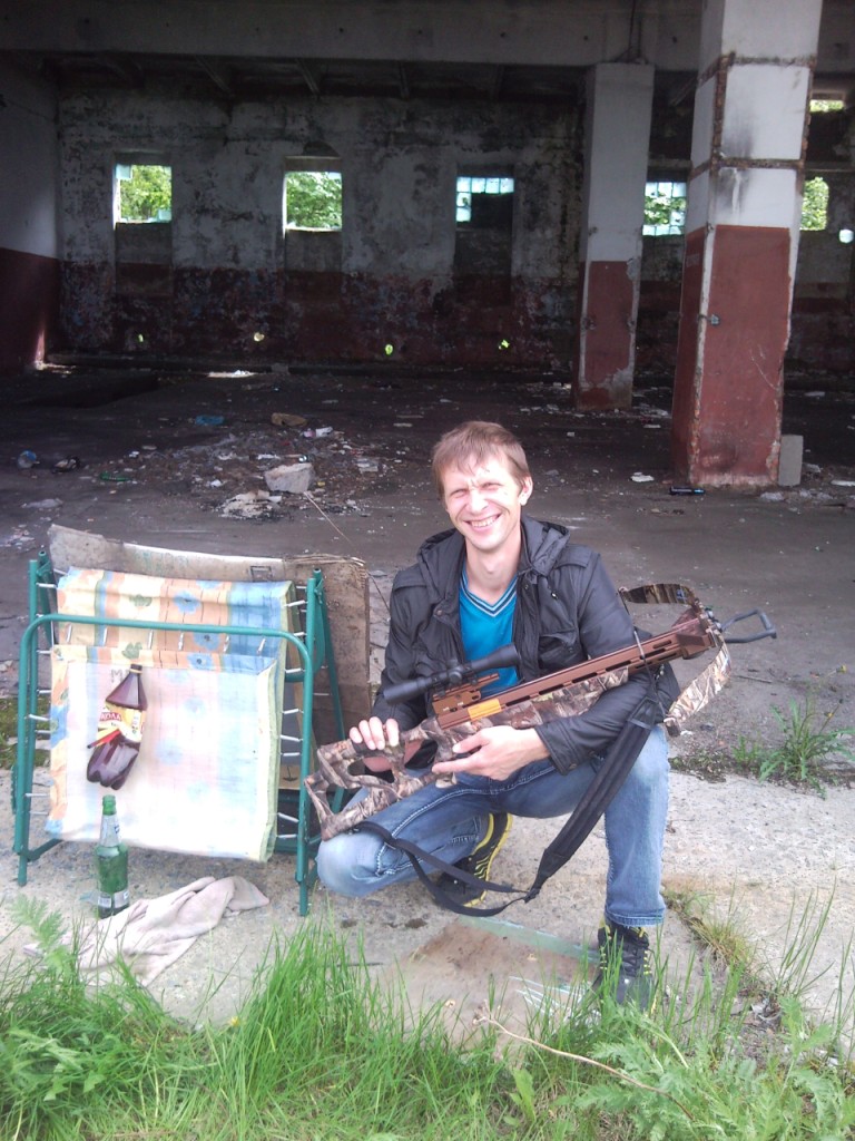 всем привет. Сегодня с женой съездили пострелять из арбалета, жена клянется и божится что стреляет впервые из какого-либо оружия. Стреляли с расстояния примерно 25 метров, за мишенью таки поставил раздобытую за бутылку шампанского раскладушку. Результат раскладушки превзошел все ожидания. Раскладушка сложенная втрое удерживает стрелу в натянутой тряпке, оперение застряёт в первой линии ткани, а если подставить фанерку, то оперение не достает до ткани и не портится. Стреляли по литровой бутылке пластиковой сначала, затем по пол литровой бутылке и стаканчику(поехали стрелять и мишени забыли