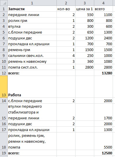 На СТО делали переднюю ходовку и замену расходников к двс. По качеству претензий нет. Прошу прокомментировать стоимость на запчасти и работу. Если цена нормальная то буду дальше к ним обращаться.