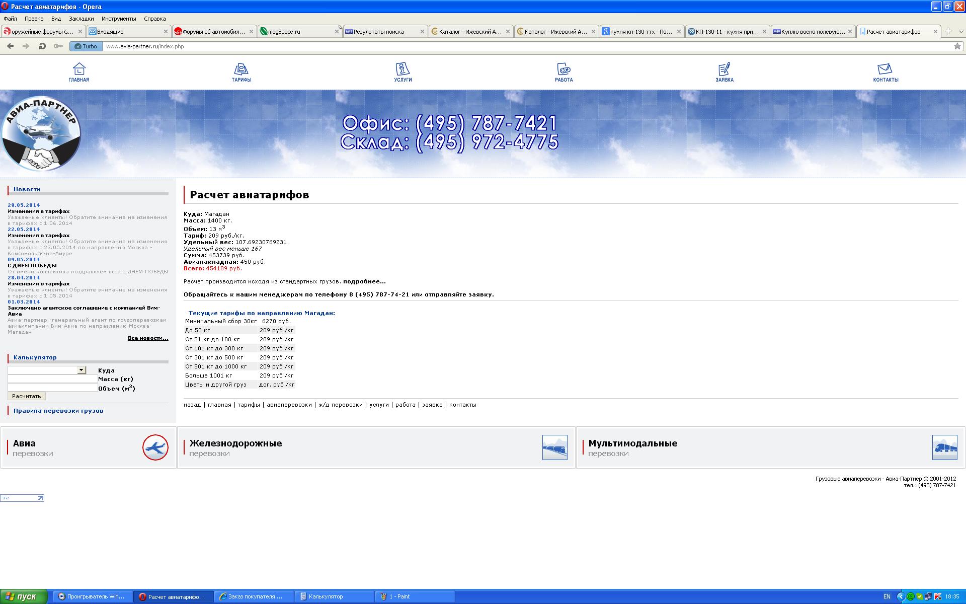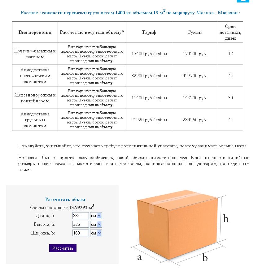 Доставка бесплатна... У неё "сухой" вес 1400 кг. Авиатариф рублей (грубо) 200/кг. Итого 280000 (двести восесьдесят тысяч) рублей. Вы уточните этот вопрос. Может вы что-то не правильно поняли. Может бесплатная доставка по Москве до т/к. Вам её могут запросто отправить авиа. С оплатой авиатарифа при получении. Вот там и можно прозреть.Шанс, может и КП -130 я уже запуталась, их столько пересмотрели! .... Пойду посчитаю на сайте Сообщение отредактировал shans2 - 11.6.2014, 18:38 -------------------- Спасибо! — София