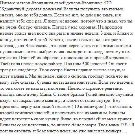 Вчера произошел такой случай: Еду в вагоне метро, напротив дверей. На остановке заходит девушка-блондинка. Глаза полные беззаботности, каблучки, в общем, милая такая. Встает рядом, достает плеер и оттуда так оглушительно начинает рубить Nightwish. Ну, думаю, у каждого свои вкусы. Далее она достает книгу, сборник японской поэзии XIX века, причем в оригинале на японском, и начинает спокойно читать. Мое лицо немного вытянулось. Ну и под конец ее чтение прерывает звонок мобильного. Далее, разговор: - Да... угу.. Значит так: блок питания крепишь в самом верху задней части системного блока четырьмя болтами, от него отходит провод питания.. Что значит куда? К материнской плате, жесткому диску, дисководу.... Угу.. Нафига ты решил собрать комп, если ничего не смыслишь в этом!? Выключает телефон, замечает мое в конец ох@евшее лицо, и так мило улыбаясь, говорит: - Спокойно, я крашенная... Выпал, нах, в осадок)))) |