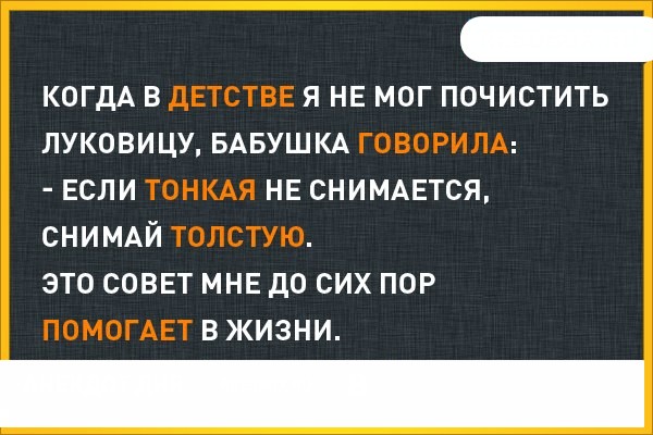 - Что делаешь? - Смотрю фильм "Неадекватные люди". - Я этот фильм на работе с 8:30-ти до 18-ти смотрю. -------------------- Политики – словно подгузники. Их надо почаще менять. И по той же причине.