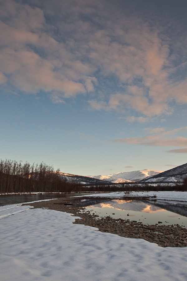 Красивейшая река, я Вам доложу. Расположена на юге Магаданской области. Богатая рыбой. Ехать до места рыбалки от города 4 часа чистого времени, а с переправой через р. Яна - как повезет. Чтобы успеть на первый паром, выехали за 4 часа до переправы. Выскочив на первый Арманский перевал, понял, что быстро доехать не получится - перевал в снегу, а недавно начавшийся дождь добавил еще и тумана. В общем соскользили мы с первого. На втором все было проще, но талые воды подрасквасили дорогу, а автотранспортные средства, снующие туда-сюда дорогу подразбили. Не толстым ковром повсеместно лежал снег... К переправе приехали за час до ее начала. Оказалось, что мы не одни такие умные - там уже стояли две машинки, а по реке баражировали нерпы. Значит рыба - лосось в реку еще продолжает заходить. Расположились мы с комфортом, потрескали семечек жареных и дождались парома. Как и предчувствовали - особых правил в переправе не было: у кого нервы прочнее - тот и прав, но все-таки было спокойней, чем в мою поездку летом. На втором пароме переправились и рванули в пос. Талон, где забрали лодку. Закидали вещи в нее и вперед, вверх. Погода сгущала тучи, ну и слегка нам проверила на промокаемость. Дойти успели засветло. База в снегу... За годы поездок у нас сложился ритуал - приезжая на место мы всегда готовим борщ. Такой чтобы аж ложка стояла... Этот раз не был исключением. Борщ получился наваристым и всеми был оценен по достоинству Утро. 7 часов. Поднялись. Перекусили. В лодку и вперед. Зяяяяааабкооооо!!! Но в подобранной одежде и термобелье - очень комфортно. А как хорошо в Rapala ProWear! Не продувает. Не надо думать куда садиться - сел и все, а мокрое или нет - не важно. Вот только ботинки постоянно надо сушить... В одной из поездок они мне позволили остаться сухим - провалился по пояс в болото около озера. Лед меня не выдержал.. Был бы в сапогах - пришлось бы сушиться, а так просто выбрался из болота Накануне в коробочку из-под тройников набрал воблеров, положил несколько микроколебалок, а в сумочку заложил колебалки (в основном Daiwa Masau) и поместил туда крупный воблер Smith Cherry blood MD75 в цвете 04 . С собой, конечно же, взял ультралайт. Было решено забраться повыше, а затем скатываясь останавливаться на плесах и проверять на них рыбу. Вода чуток мутновата, но дно на 2 метрах просматривается. Забрались километров на 15. Ничего. Ниже. Ничего. Еще ниже - снова никак. Так скатились почти до базы. Стали километрах в 2 от нее. Никак. Странно... Предположил, что днем рыба вжимается в дно. Уронил колеблющуюся блесну Smith Buch SP на 10 г на дно. Повел. О! Кто-то ее толкает! Повторяю и вот перед нами кунджа. Очень хорошо. Повторяем эксперимент. Все отлавливаются. В голубом небе здоровенными косяками с криком проносятся белоснежные лебеди. Прощаются с Северо-Востоком до следующей весны. Клев прекращается. Ставлю улавливателя платной форели - Smith Camion DR цвет 21. Глубоко он убегает, аж до 1,8 м. Этакий жучок плывет под водой, вихляет весь. И конечно приводит рыб. Несколько поклевок были прям у поверхности. Даже заглубляться не успевал, а хариус на нем уже едет. Снова заканчивается клев. Рыба крайне вялая. Поклевки словно прикосновения. И вновь смена приманок. На этот раз достал Smith Still цвет 11. Каково же было мое удивление, когда он стал приносить рыбу. Проводка - любая. Слегка отловились. Солнце - к закату, мы - на базу. Утро субботы было мороз