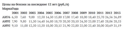 Я в 1999-м году на сто рублей заправлял 20 литров топлива по 5 рублей за литр. Теперь литр стоит почти 50. За 15 лет стоимость литра выросла в 10 раз. -------------------- |