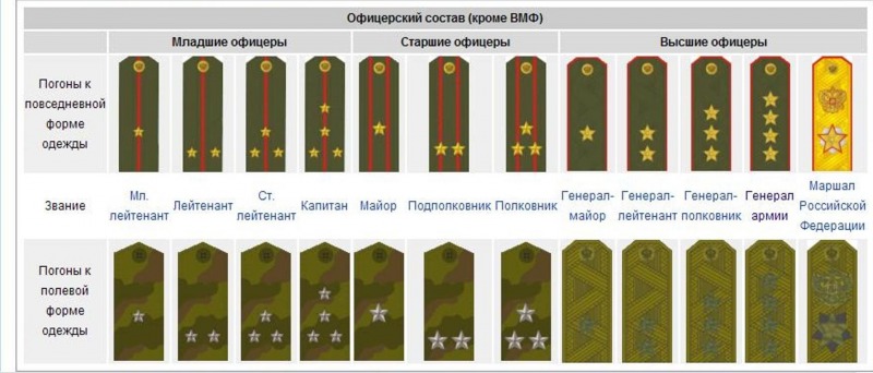 картинка то старая-младших лейтенантов уже нет. Наверное Генерал Армии теперь не 4 звезды, а одна маршалская. А маршала убрали. Не может же быть, чтоб у министра обороны было не старшее звание, правильно? Жаль на инете деньги кончились. П.С. Шойгу тувинец! Стопудов заточку носит.