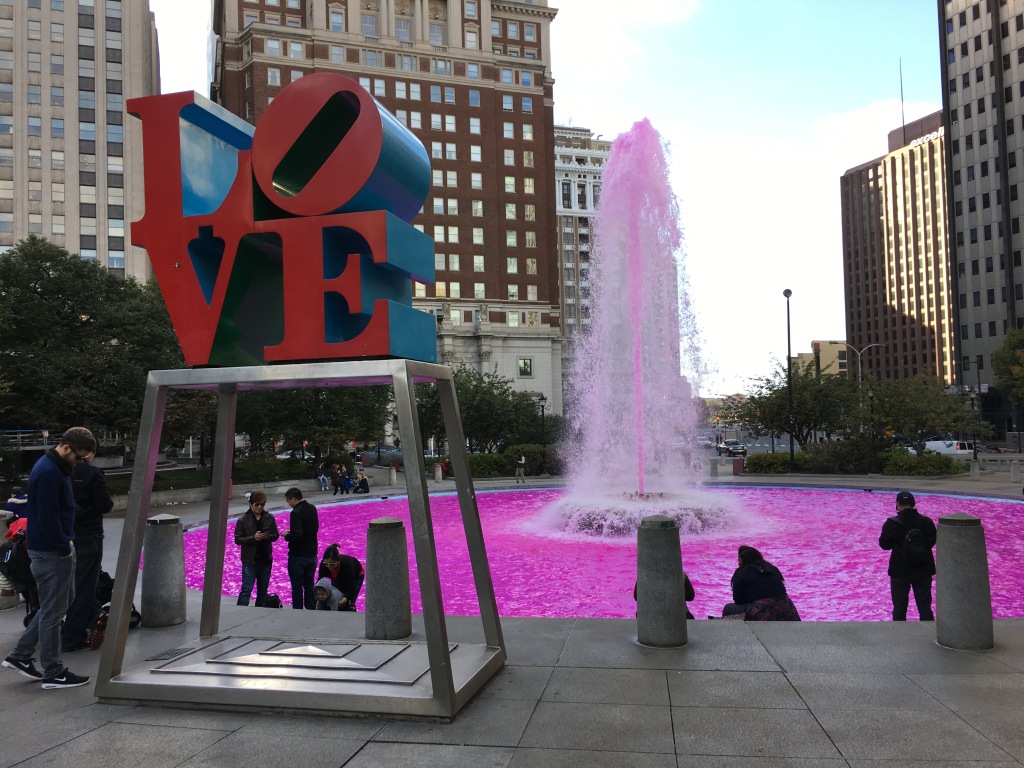 Поэтому здания, фонтаны, на достопримечательности вешаются розовые ленты, розовые бусы, здания и фонтаны подкрашиваются, белый дом, короче все все вокруг - в розовых тонах. Фонтан вот тоже. В другие месяцы он обычного цвета. Вот на дракона повесили тоже бусы розовые, смотри. Спасибо! — Юлия