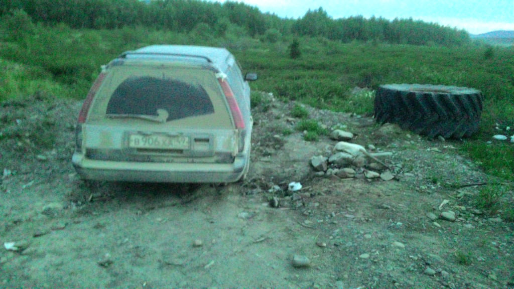 Пройдено 715 км. Всего 22099 км. Ледяное дыхание севера чувствуется очень хорошо, особенно поутру. Близится к концу моя многокилометровая поездка, финишная прямая (с ямами и колдобинами) уже близко, отчего становится немного грустно. Привет, федеральная автодорога «Колыма»! И начинается она со своего самого отвратительного участка, если не считать жалких нескольких километров асфальта возле Нижнего Бестяха. Было очень тепло, солнечно, без осадков, а значит, пыльно. Ехать было крайне тяжело, дорога очень пыльная, а местами вообще сделана из какого-то песка. Любой автомобиль за собой оставлял «туман» длиной в километр, если не больше. А уж за грузовиками ехать было «одно удовольствие». Впрочем, легендарным якутским серым буханкам было практически пофиг на это, они совершали очень рискованные обгонные маневры на поворотах в условиях нулевой видимости, там где я с «окэйфэйсом» плелся позади, матеря местных дорожников. Тем не менее, окружающая обстановка сглаживала негативные впечатления от дорожного покрытия. Вокруг было на что посмотреть, и я даже частенько останавливался пофотографировать всякое. Делаю остановку на перекус в селе Уолба. Завтракаю интересной штукой представляющей из себя микс пирожка и бутерброда. Снаружи вроде пирожок печеный, а внутрь вложены огурец, помидор и кусок ветчины. Вкусно и недорого, как обычно в Якутии и бывает. Добираюсь до томпонского района, а там уже недалеко переправа. На паром я прибыл третьим, и как позже выяснилось, последним. После меня не приехал никто. Я был почти уверен, что сегодня мы не уплывем, но спустя три часа все-таки двинули к другому берегу. В этот раз против течения Алдана. Плыли около часа. Все три часа ожидания мне было решительно нечего делать, интернета нет, вещает одна скучная радиостанция, оставалось только наслаждаться красотами вокруг. Представляю каково работать тут каждый день, когда красоты становятся по барабану. К пяти вечера я добрался до Хандыги. Затарился эксклюзивным якутским спиртным напитком «Кэскил», заправился 92ым бензином и поехал дальше. За ужином в кафе в селе Теплый Ключ я подумал, что ночевку здесь искать рановато, потому вопреки своему обычному плану я решил ночевать там, куда доеду. Это в тему про самый длинный Первый знак, показывающий расстояние до Магадана (если не считать знака на развязке, который я не видел) На томпорукском перевале у меня в первый (!) раз за двадцать две тысячи километров от старта пробивает колесо, заднее правое. А я уж начал думать, что зря взял три запаски. Далее был сложный участок — через дорогу растеклась речка. Было сравнительно неглубоко, но кариб невысокий автомобиль, и препятствие мне показалось сложным. К счастью, передо мной ехала фура, которой я сразу упал на хвост и аккуратно без последствий проехал. Такое не может не впечатлить Уже на запаске На одном из участков перевала навстречу проехал грузовик с магаданскими номерами. Приятно было встретить среди этой глуши машину с 49ыми номерами, водитель грузовика даже посигналил мне, возможно в качестве приветствия, а может просто с кем-то перепутал. Дальше, недалеко у границы Оймяконского района на дороге стоял уазик-буханка (серого цвета конечно же), экипаж, крутящийся возле него стал махать мне руками. Я остановился, мало ли чего случилось. Подошел якут и спросил чего это я оста
