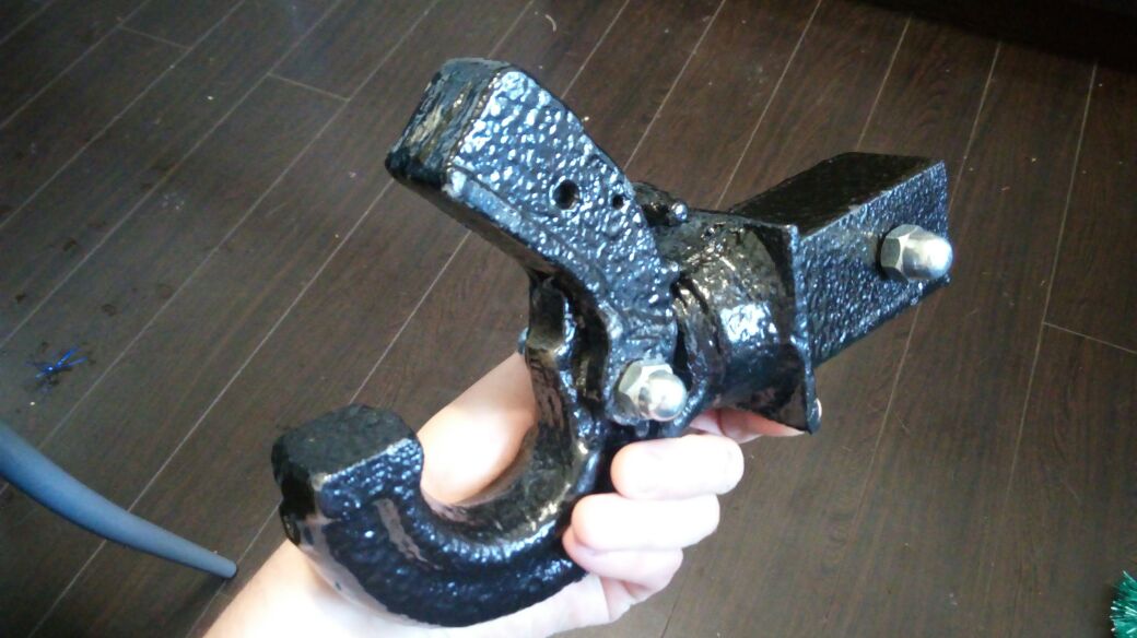 Не решился я покупать крюк для фаркопа за немалые деньги, решил сделать сам. Снял с убитого УАЗика фаркоп, обрезал на нем крепеж, квадрат (трубу) сварил из двух уголков, найденных в груде металлолома. Соединил фаркоп и трубу через металлическую пластину (для прочности). Покрасил всё это дело антигравием и нанес лаковое покрытие для блеска. Вместо простого болта на фаркопе поставил болт с обрезанной шляпой и накрутил с обеих сторон гайку-колпачек. Тоже самое проделал для установки крюка фаркопа к самому фаркопу. Итог: потратил рублей 50 на гайки и болты, 1000 отдал за сварочный работы, остальное всё бесплатно.