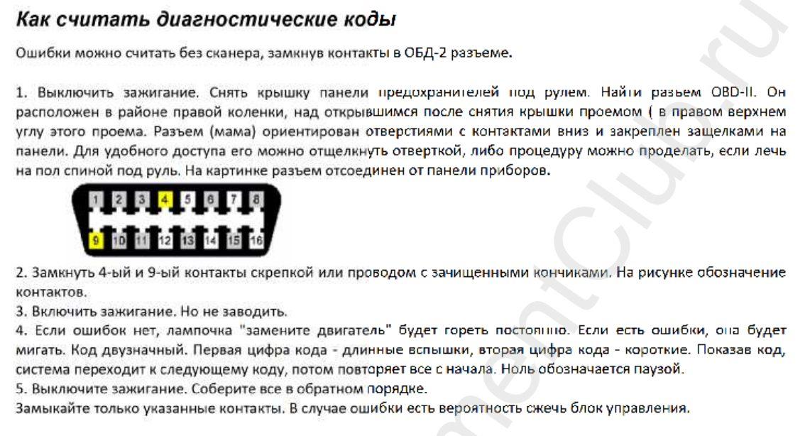 и чем самодиагностика не нравится? Цитата Всем привет. Вычитал в нете что можно считать коды ошибок замкнув на диагностическом разъёме 4 и 9 контакт Цитата Если в работе двигателя или датчиков автомобиля Хонда возникает неисправность, на панели загорается лампочка MIL (Check Engine). Считать коды ошибок Хонда можно самостоятельно и без специальных устройств, нужно лишь замкнуть два контакта на сервисном разъеме. При этом ошибки будут выводиться как серия последовательных миганий индикатора MIL: сначала число длинных миганий, соответствующее десяткам, а затем коротких – единицам (например, ошибка 21 будет выглядеть как 2 длинных мигания и 1 короткое). Если ошибок несколько, мигать они будут по очереди, пауза между ошибками – примерно 2 секунды. Таким образом, чтобы узнать коды ошибок Хонда, вам необходимо посчитать количество миганий. Итак, контроллер Хонда (модели Аккорд, Цивик, СР-В, Фит, Одиссей и другие) может выдавать следующие коды ошибок и неисправностей: 00000 ECU Defective ECU 00001 Primary O2 sensor Open or short in O2 sensor circuit, defective Primary O2 sensor 2 Secondary O2 sensor Open or short in O2 sensor circuit, defective Secondary O2 sensor 3 Manifold Absolute Pressure sensor Open or short in MAP sensor circuit, defective MAP sesnor 4 Crankshaft Position sensor Timing belt slipped, defective CP sensor 5 Manifold Absolute Pressure sensor Reading too low or too high, defective MAP sensor 6 Engine Coolant Temp circuit Reading too low or too high, open or short in circuit, defective ECT circuit 7 Throttle Position circuit Reading too low or too high, open or short in circuit, defective TPS circuit 8 Top Dead Center sensor Open or short in TDC sensor circuit, defective TDC sensor 9 Cylinder Position sensor Open or short in CYP sensor circuit, defective CYP sensor 00010 Intake Air Temperature sensor Open or short in IAT sensor circuit, defective IAT sensor 12 Exhaust Gas Recirculation Valve Open or short in EGR valve circuit, defective EGR valve 13 Barometric Pressure sensor circuit Defective ECM (Barometric sensor) 14 Idle Control System Malfunction Defective IAC valve, defective fast idle thermo valve, throttle body 15 Ignition Output Signal Missing, defective or noisy Ignition Output Signal 16 Fuel Injector System Defective or malfunctioning Fuel Injector System 17 Vehicle Speed sensor circuit Open or short in VS sensor circuit, defective VS sensor 19 Lock-up Control Solenoid Open or short in LCS circuit, defective LCS solenoid 20 Electrical Load Detector circuit Open or short in ELD circuit, defective ELD circuit 21 VTEC Solenoid Valve Open or short in VTEC solenoid valve circuit, defective VTEC solenoid valve 22 VTEC Oil Pressure Switch Open or short in VTEC OPS circuit, defective VTEC pressure switch 23 Knock sensor circuit Open or short in Knock sensor circuit, defective Knock sensor circuit 30 A/T FI Signal A high/low input Defective AFSA line, TCM 31 A/T FI Signal B high/low input Defective AFSB line, TCM 35 TC STB Signal 36 TC FC Signal 41 Primary Heated O2 sensor heater circuit Open or short in Primary O2 sensor heater circuit, defective Primary O2 sensor heater circuit 42 Right Heated Oxygen Sensor (HO2S) Heater 43 Fuel Supply System Defective or malfunctioning Fuel Supply System 44 Fuel Supply System (Slave) 45 System too lean/rich Fuel supply system, Primary O2 sensor, MAP sensor, contaminated fuel, valve clearance, exhaust leakage 46 System Too Lean or Too Rich (Slave) 48 Lean Air Fuel sensor Open or short in Lean Air Fuel sensor circuit, defective Lean Air Fuel sensor 53 Right Knock Sensor 54 Crankshaft Speed Fluctuation sensor Open or short in CKF sensor circuit, defective CKF sensor circuit 56 Variable Valve Timing Control (VTC Oil Control Solenoid Valve 57 Variable Valve Timing Control (VTC) Phase Gap 58 Top Dead Center sensor #2 Open or short in TDC sensor circuit, defective TDC sensor 59 CYP Sensor (Cylinder) 60 Air Pump malfunction 61 Primary Heated O2 sensor Slow response, exhaust leak, defective Primary Heated O2 sensor 63 Secondary Heated O2 sensor Slow response, exhaust leak, defective Secondary Heated O2 sensor Чтобы сбросить коды ошибок Хонда, нужно извлечь главный предохранитель или скинуть клемму аккумулятора на 15–20 сек. спер ссылка доступна только зарегистрированным, ссылка доступна только зарегистрированным и ссылка доступна только зарегистрированным Сообщение отредактировал usver - 26.2.2016, 21:21 -------------------- Спасибо! — hronik