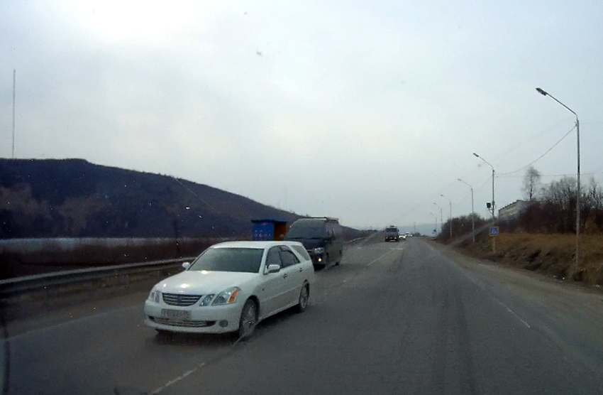 Пятница 13 даёт о себе знать.. Кто-то обгоняет на пешеходном переходе (белый Mark II Blit - 852), кто-то пересекает стоп-линию и ломится в левый ряд (голубая Toyota Allex - Т579ЕС49). Нечисть активизировалась)