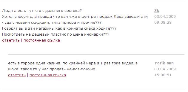 По зомбоящику показали автовыставку во Франкфурте,лада не приехала,немцы сами выставили приору, калину(7800 евро),ниву выпускается с 77 г.Так они снизили пошлину на ввоз наших дров,диктор говорит круто повысились продажи Ваза в германии,правда они меняют болты на нержавейку,антикоррозию делают и двига-евро-4.Так и хочется письмо написать:Дядька Путинг ладу на экпорт,а нам дайте "гав.." японское покупать.