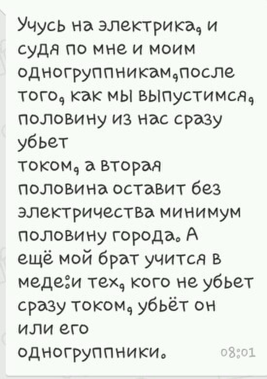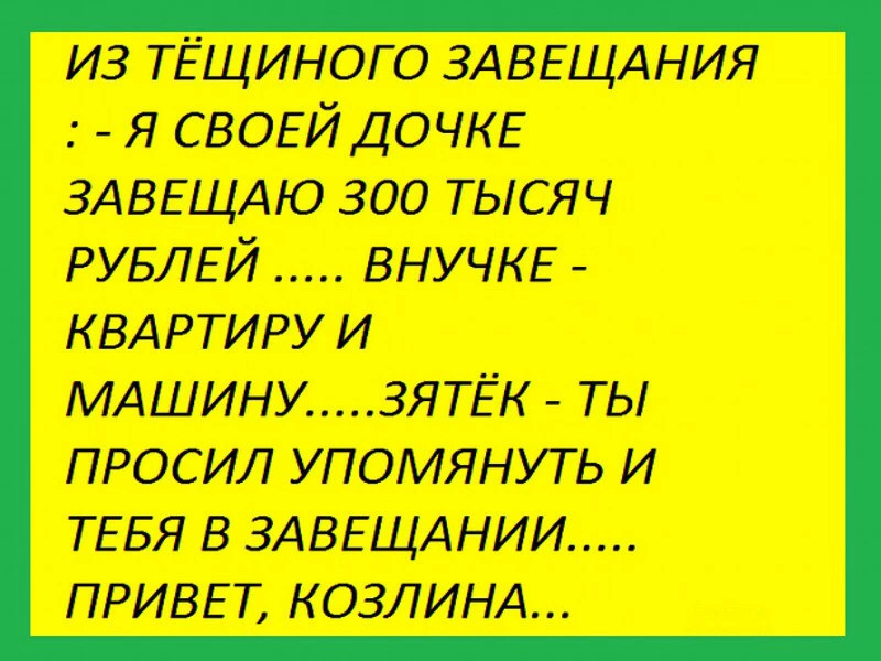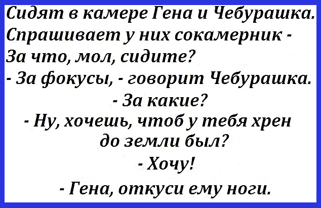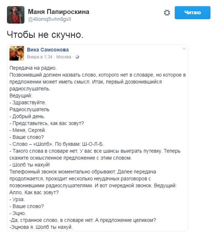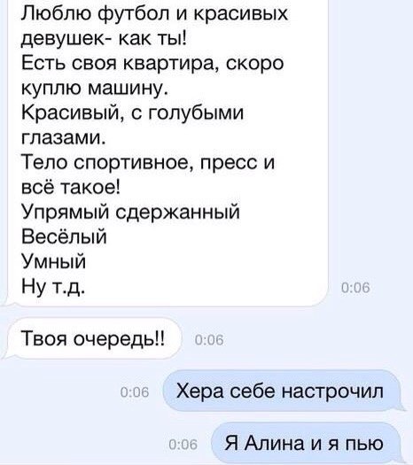 мы доченьку назвали варей а как ещё с такой то харей *** я хозяин слова раз сказал женюсь не талдычь об этом каждый год мне люсь *** я почистил карму выхожу в астрал но пришлось вернуться кот опять насрал *** игорь взял оксану твёрдою рукой за большой вторичный признак половой *** в чём то я конечно как англицкий принц с мамой проживаю до седых яиц *** грудь была округлой с кожей матовой а теперь на палец хоть наматывай *** глеб смотрел как зоя лижет эскимо дальше получилось как то всё само *** розы михаилу вновь несёт антон видно промахнулся где то купидон *** павел говорил мне веселее будь и водил руками где должна быть грудь *** от родного лая на душе светло я жену узнаю через всё село *** -------------------- |
