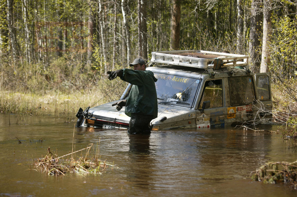 ссылка доступна только зарегистрированным Цитата То, что 50 процентов проходимости внедорожнику обеспечивает резина, известно давно и до сих пор никем не опровергнуто. Причем давайте сразу договоримся, что под термином "проходимость" мы подразумеваем исключительно способность автомобиля самостоятельно передвигаться в условиях бездорожья, а не всевозможные вариации волочения на лебедке. Доводку серийного образца Land Cruiser 70 мы начали с установки больших колес. Изначально это были катки BF Goodrich 33х12,5х15. Но поскольку максимальный диаметр колес, которые можно было поставить без каких-либо доработок, не превышал 32 дюймов, то пришлось поставить усиленные пружины и специальные проставки под них. Разумеется, мы понимали, что грамотнее было бы лифтовать машину не только модернизацией подвески, но и подъемом кузова относительно рамы (такой подход позволяет добиться того же результата при меньшем подъеме центра тяжести и меньших углах "переламывания" карданов). А посему, когда стал вопрос об увеличении радиуса колес до 35 дюймов, подвеску уже не трогали и дополнительный лифт свелся к установке тридцатимиллиметровых проставок в местах крепления кузова к раме. Стоит заметить, что 35 дюймов - оптимальный размер колес для "семидесятки". При меньших страдает проходимость, а при больших возросшие нагрузки на трансмиссию ухудшают такой немаловажный показатель, как надежность. Да и динамика разгона, даже с учетом отнюдь не гоночной направленности, становится неприемлемой. Но у всякого решения есть и оборотная сторона... Например, установка колес большого диаметра настоятельно потребовала решения еще одной проблемы - накачать даже один баллон обычным насосом за какое-то разумное время практически невозможно. А ведь ни для кого не секрет, что при движении по болоту катки желательно подспускать до 0,5 атмосферы (и соответственно снова накачивать при выезде на более-менее твердый грунт). Да, пара отечественных компрессоров "Мустанг" в конечном итоге справляется с этой задачей, но с большим трудом и долго. А потому был приобретен компрессор Volcano, конструкция которого позволяет стационарно закрепить его в машине. Но как ни задирай свой внедорожник, на трассе любого трофи-рейда обязательно найдутся места, где даже монстр на огромных колесах беспомощно сядет на брюхо. И тут уж выбора нет - остается продвигаться вперед на лебедке... Изначально наш выбор пал на электрическую лебедку WARN 8000. И, надо сказать, она достойно служила на протяжении двух лет. Одно плохо: как и всякое электрическое приспособление, этот "винч" боялся воды и требовал постоянной профилактики. Плюс к этому электродвигатель не выдерживал долгой работы под хорошей нагрузкой и перегревался. Да и тяговое усилие вкупе со скоростными характеристиками оставляли желать лучшего... Короче, посмотрев на очередной "Ладоге-трофи", как работает штатная механическая лебедка Toyota, было решено установить себе такую же. Но, увы, "семидесятки" комплектуются механическими лебедками довольно редко, и найти б/у агрегат оказалось проблематичным. Стоимость же нового комплекта наводила на мысли об изощренной мести японцев за наше нежелание поделиться Курилами. Пришлось устанавливать лебедку от Toyota Land Cruiser 60, которая встречается существенно чаще, а по конструкции мало чем отличается от "родной" "семидесятой". П