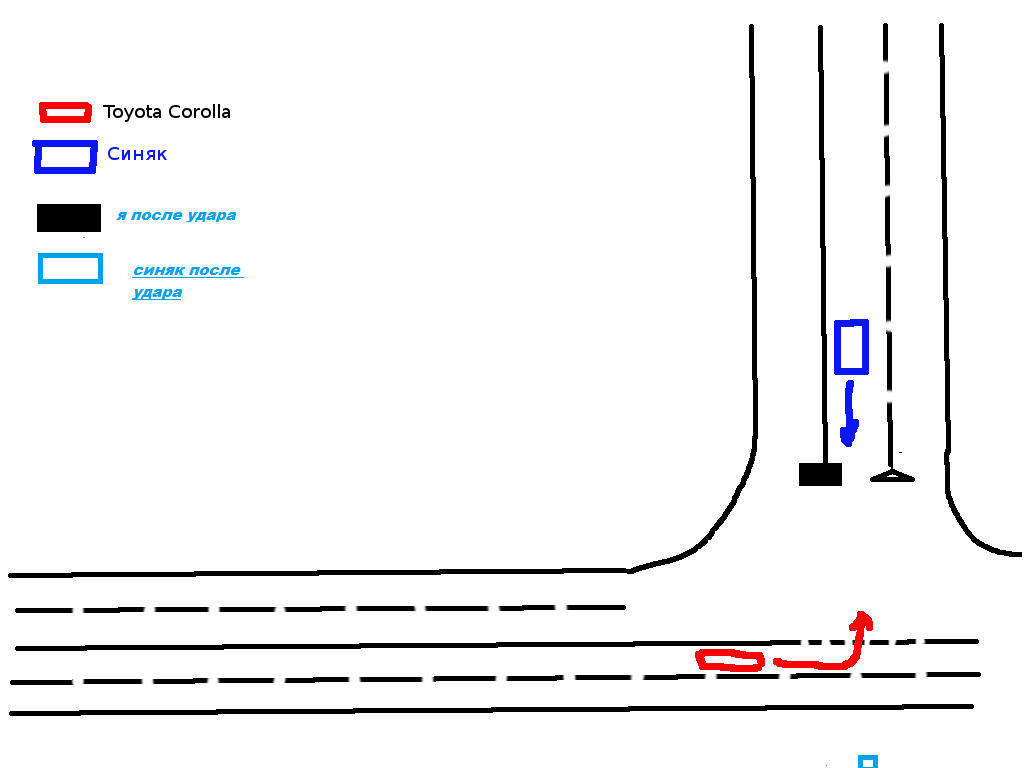 Я понял это так. Не забываем про машину с автовокзала. Где оказались машины после дтп? . Если синий шёл прямо, а ваша полоса была занята зелёной то получается вы вышли ему в лоб паралельно с зелёной? Сообщение отредактировал ObiVan - 3.1.2018, 13:47 -------------------- Choose what is right, not what is easy. Ordnung und arbeiten. Do the best you can and no regrets.
