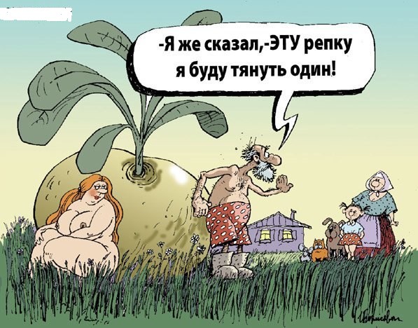 Семеро гномов собираются на работу. Белоснежка провожает их у дверей. 1 гном: - До свидания, любимая Белоснежка. Ты такая красивая и так вкусно готовишь. Как бы я хотел и на ужин съесть такой же большой яблочный пирог. 2 гном: - Не скучай без нас, дорогая Белоснежка! У тебя такие умелые руки, сшей мне, пожалуйста, новый камзол и чудесную шапочку. 3 гном: - Доброго тебе дня, ласковая Белоснежка. Ты такая же прекрасная, как цветы на нашей клумбе, политые твоими заботливыми руками. 4 гном: - Не грусти без нас, милая Белоснежка. Вечером мы вернемся и с удовольствием послушаем твою новую песенку! 5 гном: - До скорой встречи, добрая Белоснежка. Как же я люблю после трудного дня лечь в заправленную тобой кроватку! 6 гном: - Теплого солнышка и ласкового ветерка тебе, Белоснежка. Мы теперь еще больше любим свой домик, который ты так аккуратно прибираешь каждый день. 7 гном (самый маленький): - А я люблю чай с малиной и земляничное варенье. Белоснежка (закрывая дверь): - За@бали... -------------------- Не бывает некрасивых марсианок, бывает мало мутагенного урана.