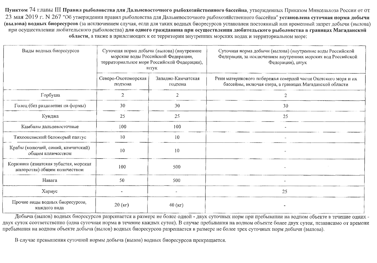 Цитата Объясните пожалуйста про две бесплатные рыбы "красной" породы. Пишут что две можно поймать бесплатно на спиннинг - две горбуши в сутки. на участках, определенных Правилами рыболовства. для Магадана это Дукча от устья до подвесного моста. и еще 11 участков на море, из рек только дукча. приложение № 5 к Правилам рыболовства для Дальневосточного рыбохозяйственного бассейна. приказ Минсельхоза № 267 от 23.05.2019 не путать с лицензионными участками. Сообщение отредактировал ZND - 28.6.2019, 16:48 Спасибо! — ryba-kit
