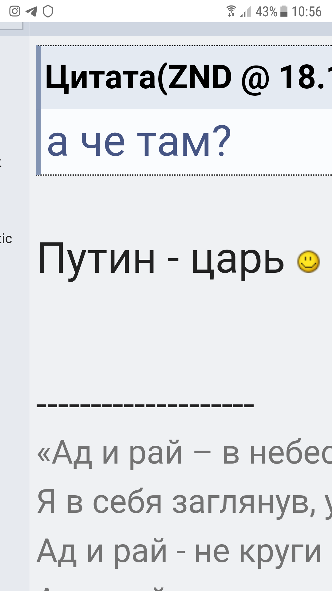 Цитата(Shiko @ 19.1.2020, 23:55) ссылка доступна только зарегистрированным Гидр, Отчасти ты прав. Но я не то, что высказывал обвинение, а изложил своё мнение о причинах возникновения споров, которые заканчиваются ничем по теме спора. не понимаю, где тут речь об обвинении. ты запостил обычный для себя пост на тему "вы сказали "винтик", а вы не уверены ли что это шурупчик или болтик". разумеется все поняли, что у нас в стране местов, об которые можно ходить в трусах, немного. но раз не прозвучало ключевое слово "по улице ходить", то типа можно повернуть всё вспять и даже время и Вселенную и Аллаха. вы с господином Incognito очень схожи в своих попытках доковыряться до слов собеседника -------------------- Разница других исполнителей, которые пытались перепеть эту песню, в том, что они поют как будто идут на войну, а Цой - будто вернулся оттуда.
