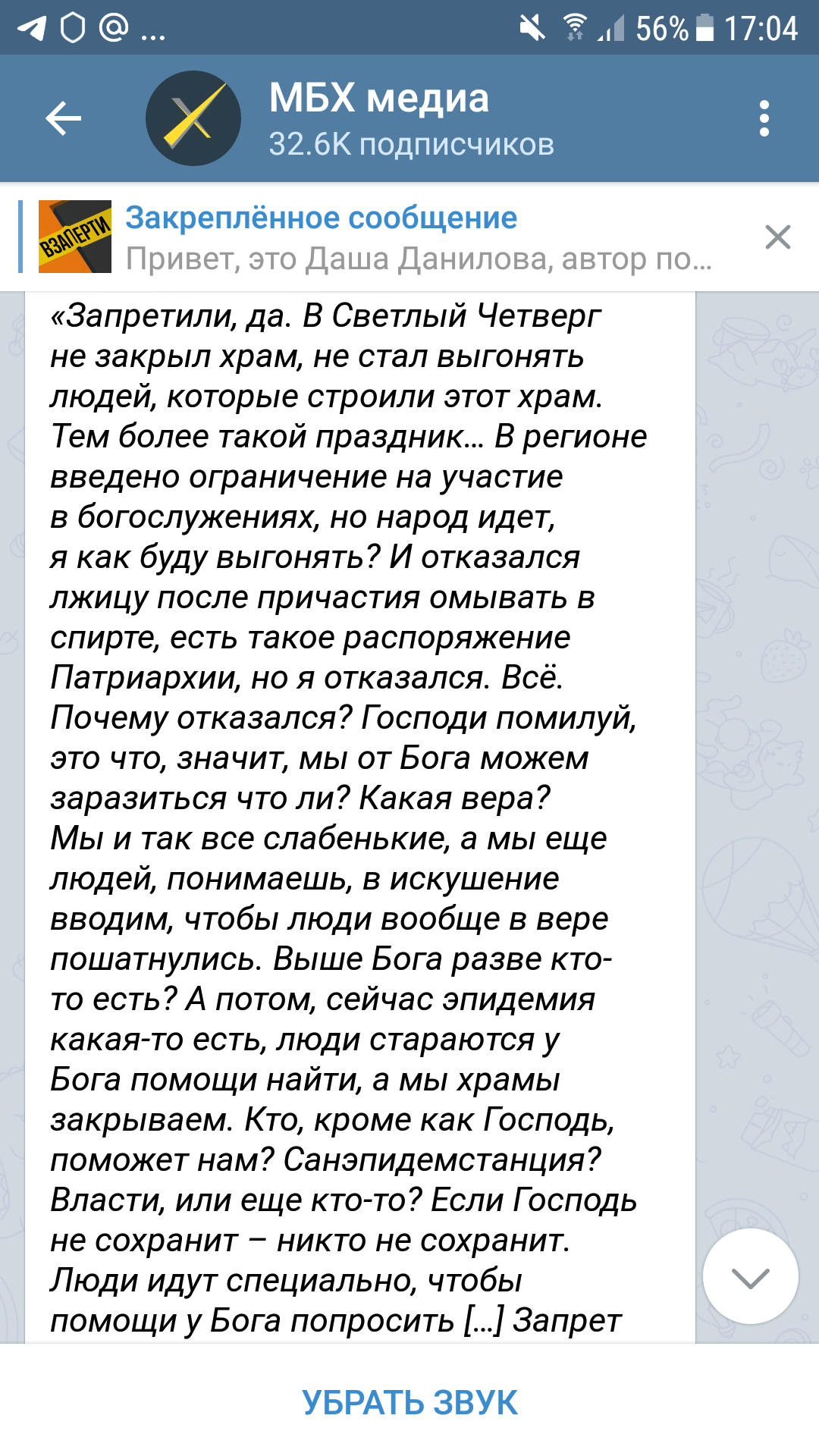 ,,По письму и рекомендации руководителя Федеральной службы по надзору в сфере защиты прав потребителей и благополучия человека, главного государственного санитарного врача РФ Поповой Анны богослужение в храме возможно, но только в закрытом режиме. Только для тех, кто выполняет эту функцию – служители церкви. Для посещения гражданами храмы закрываются. Будет выпущено постановление".
