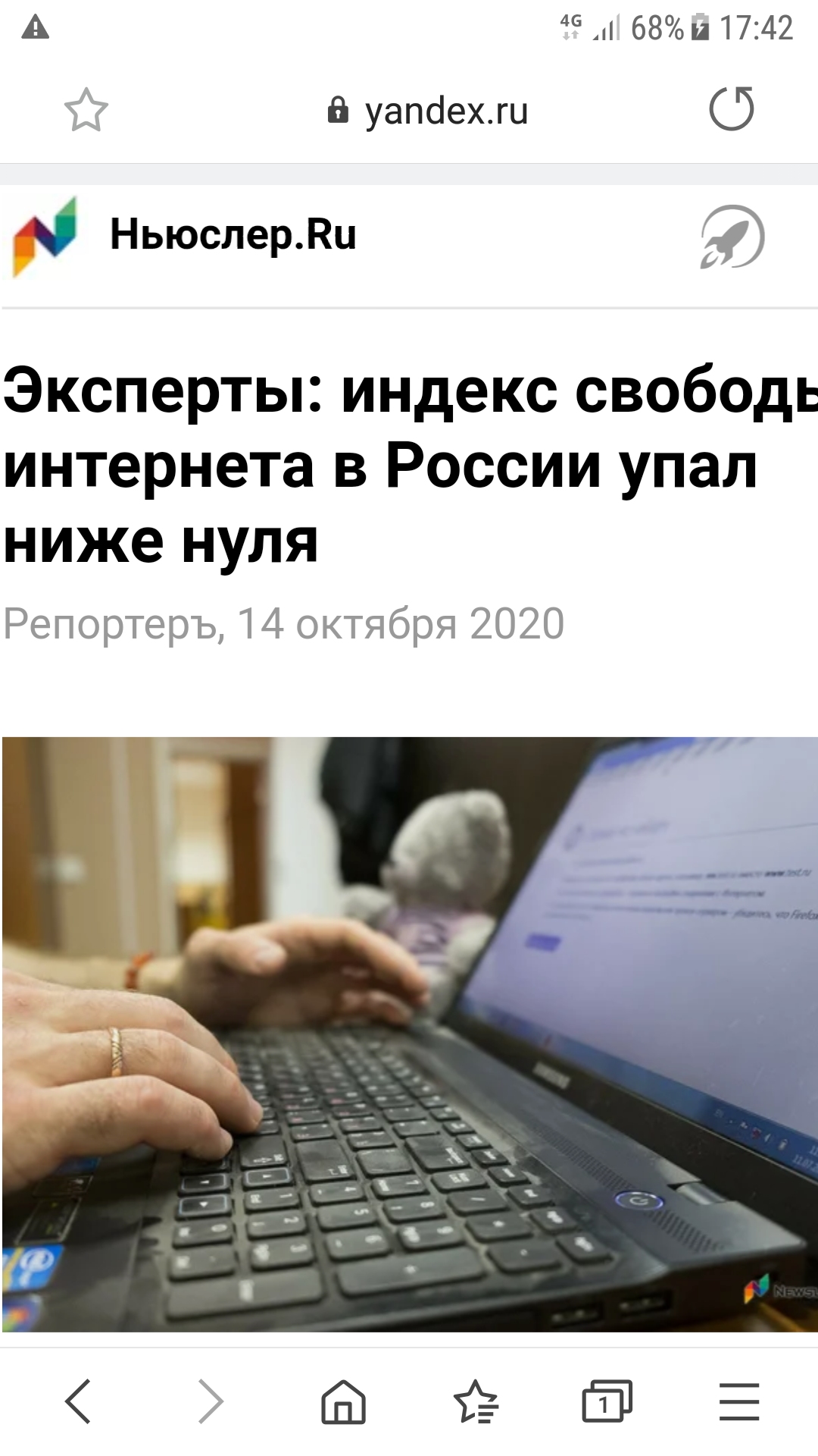 Как сообщили эксперты ОЗИ, за последние пять лет — с момента создания «Общества защиты интернета» — индекс свободы интернета в России опустился ниже нуля. В моиторинг попало 161 сообщение в СМИ, так или иначе связанное со свободой в российском сегменте интернета. -------------------- Пейте чай и всё пройдёт......
