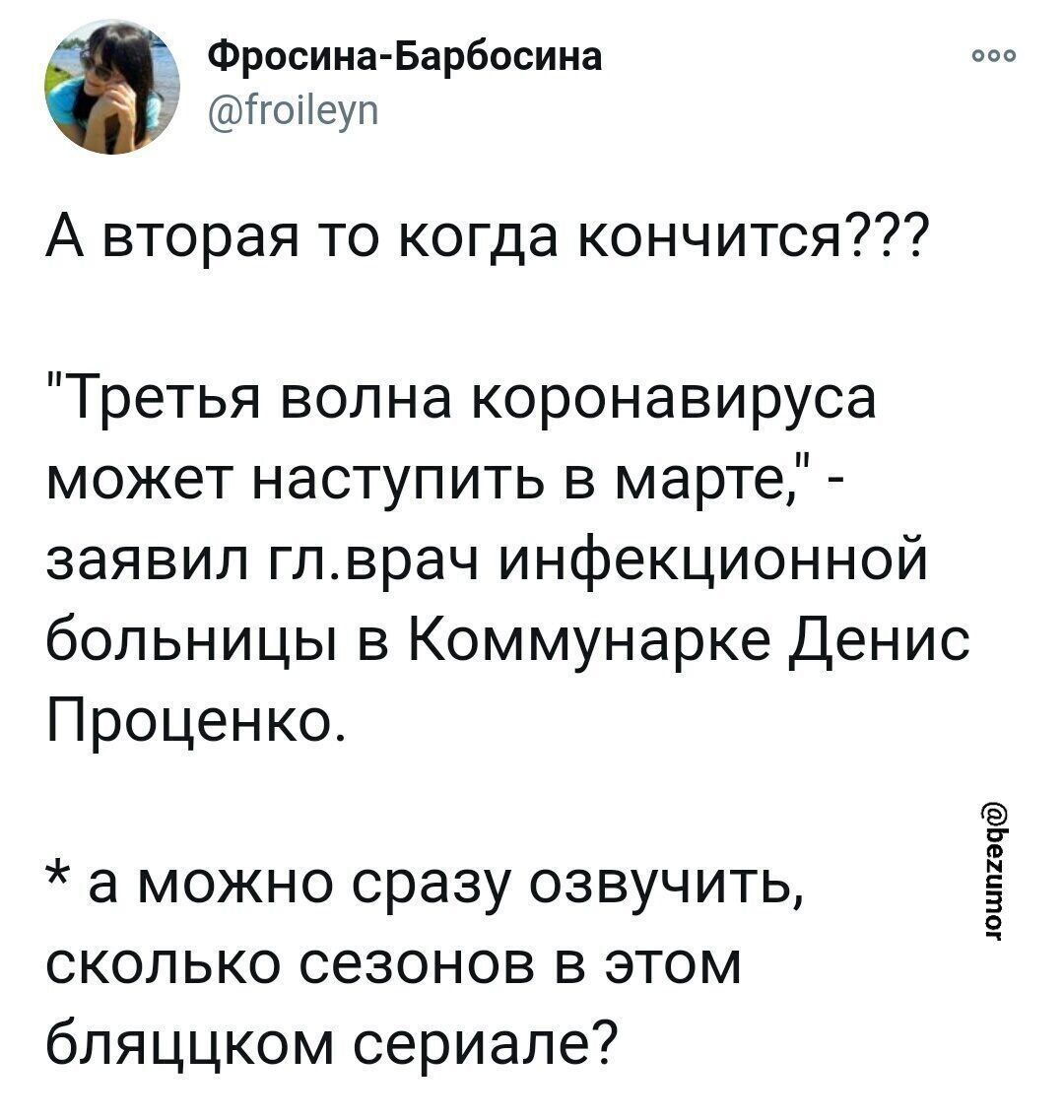 За ноябрь новых заражённых 744, вылечили 837. На сегодняшний день общее количество заражённых такое же как было 23 октября. ХЗ, что они там рисуют... ссылка доступна только зарегистрированным ВОЗ предупреждает: Дед Мороз в этом году может принести в ваш дом не только подарки. - Рабинович, как думаете, почему Роспотребнадзор запрещает россиянам собираться в местах досуга и отдыха, а на рабочих местах - пожалуйста? - Таки, молодой человек! Я вас умоляю... на большинстве российских предприятий такие условия работы, шо коронавирус НЕ ВЫЖИВАЕТ! -------------------- Политики – словно подгузники. Их надо почаще менять. И по той же причине.