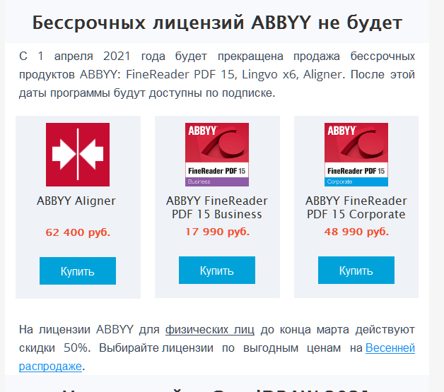 Кто планировал купить программки от ABBYY (FineReader, Lingvo и Aligner), то с 1-го апреля бессрочных лицензий ABBYY не будет.
