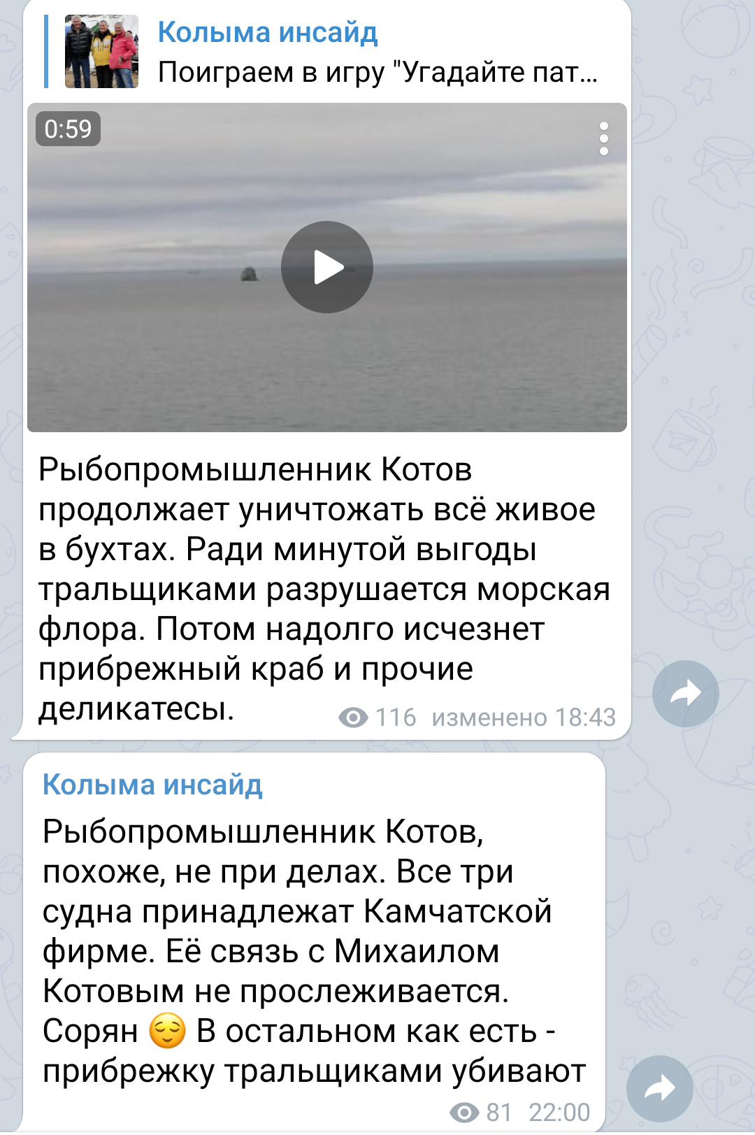 Цитата Видеоролик прокоментировали в департаменте рыбного хозяйства Магаданской области. Как отмечают в ведомстве, контроль за работой судов на акватории Тауйской губы ведется Пограничным управлением ФСБ РФ. По предоставленной информации суда, фигурирующие в видеоролике - это зашедшие на перестой суда камчатской компании, которые осуществляют рыболовство камбал в притауйском районе по выданным Росрыболовством разрешениям.