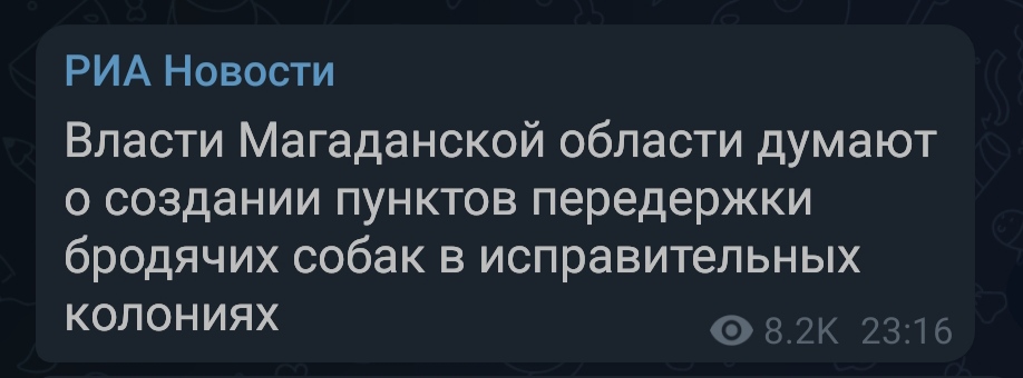 Цитата(elmont33) - ЗК Тузик! - Я! Как водится, есть мякотка: Цитата - Я беседовал с руководителем УФСИНа по Магаданской области. С его стороны есть очень хорошее предложение - создание при УФСИН пунктов передержки бродячих собак. Они уже посчитали сами: вольеры на 9-10 собак - 9-10 млн рублей. Мы можем профинансировать строительство, заключив соглашение. Лес у них есть на делянках, лес мы им выделили, они могут это сделать. Это очень хорошее предложение, мы его поддержим. Это и занятость людей в исправительных учреждениях, это и удешевление стоимости, это, если хотите – перевоспитание – уход за животными. ссылка доступна только зарегистрированным Imho, за 10 лямов можно всех собак в области жильём осчастливить. Сообщение отредактировал Poruchik - 5.2.2022, 3:43 -------------------- Ein Reich, Ein Führer, Ein Internetdienstanbieter!