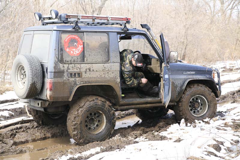 ссылка доступна только зарегистрированным Цитата То, что 50 процентов проходимости внедорожнику обеспечивает резина, известно давно и до сих пор никем не опровергнуто. Причем давайте сразу договоримся, что под термином "проходимость" мы подразумеваем исключительно способность автомобиля самостоятельно передвигаться в условиях бездорожья, а не всевозможные вариации волочения на лебедке. Доводку серийного образца Land Cruiser 70 мы начали с установки больших колес. Изначально это были катки BF Goodrich 33х12,5х15. Но поскольку максимальный диаметр колес, которые можно было поставить без каких-либо доработок, не превышал 32 дюймов, то пришлось поставить усиленные пружины и специальные проставки под них. Разумеется, мы понимали, что грамотнее было бы лифтовать машину не только модернизацией подвески, но и подъемом кузова относительно рамы (такой подход позволяет добиться того же результата при меньшем подъеме центра тяжести и меньших углах "переламывания" карданов). А посему, когда стал вопрос об увеличении радиуса колес до 35 дюймов, подвеску уже не трогали и дополнительный лифт свелся к установке тридцатимиллиметровых проставок в местах крепления кузова к раме. Стоит заметить, что 35 дюймов - оптимальный размер колес для "семидесятки". При меньших страдает проходимость, а при больших возросшие нагрузки на трансмиссию ухудшают такой немаловажный показатель, как надежность. Да и динамика разгона, даже с учетом отнюдь не гоночной направленности, становится неприемлемой. Но у всякого решения есть и оборотная сторона... Например, установка колес большого диаметра настоятельно потребовала решения еще одной проблемы - накачать даже один баллон обычным насосом за какое-то разумное время практически невозможно. А ведь ни для кого не секрет, что при движении по болоту катки желательно подспускать до 0,5 атмосферы (и соответственно снова накачивать при выезде на более-менее твердый грунт). Да, пара отечественных компрессоров "Мустанг" в конечном итоге справляется с этой задачей, но с большим трудом и долго. А потому был приобретен компрессор Volcano, конструкция которого позволяет стационарно закрепить его в машине. Но как ни задирай свой внедорожник, на трассе любого трофи-рейда обязательно найдутся места, где даже монстр на огромных колесах беспомощно сядет на брюхо. И тут уж выбора нет - остается продвигаться вперед на лебедке... Изначально наш выбор пал на электрическую лебедку WARN 8000. И, надо сказать, она достойно служила на протяжении двух лет. Одно плохо: как и всякое электрическое приспособление, этот "винч" боялся воды и требовал постоянной профилактики. Плюс к этому электродвигатель не выдерживал долгой работы под хорошей нагрузкой и перегревался. Да и тяговое усилие вкупе со скоростными характеристиками оставляли желать лучшего... Короче, посмотрев на очередной "Ладоге-трофи", как работает штатная механическая лебедка Toyota, было решено установить себе такую же. Но, увы, "семидесятки" комплектуются механическими лебедками довольно редко, и найти б/у агрегат оказалось проблематичным. Стоимость же нового комплекта наводила на мысли об изощренной мести японцев за наше нежелание поделиться Курилами. Пришлось устанавливать лебедку от Toyota Land Cruiser 60, которая встречается существенно чаще, а по конструкции мало чем отличается от "родной" "семидесятой". П