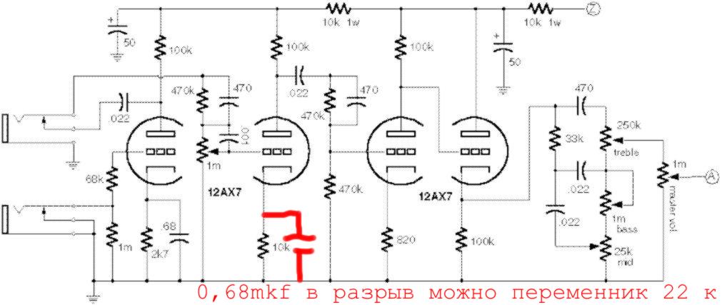 - Переносим темброблок с мастер-громкостью - ставим перед фазиком. - в катод первого триода добавляем емкость... короче вообще меняем/подбираем номиналы - между первым и вторым триодом ставим потенцометр 1M - Gain |