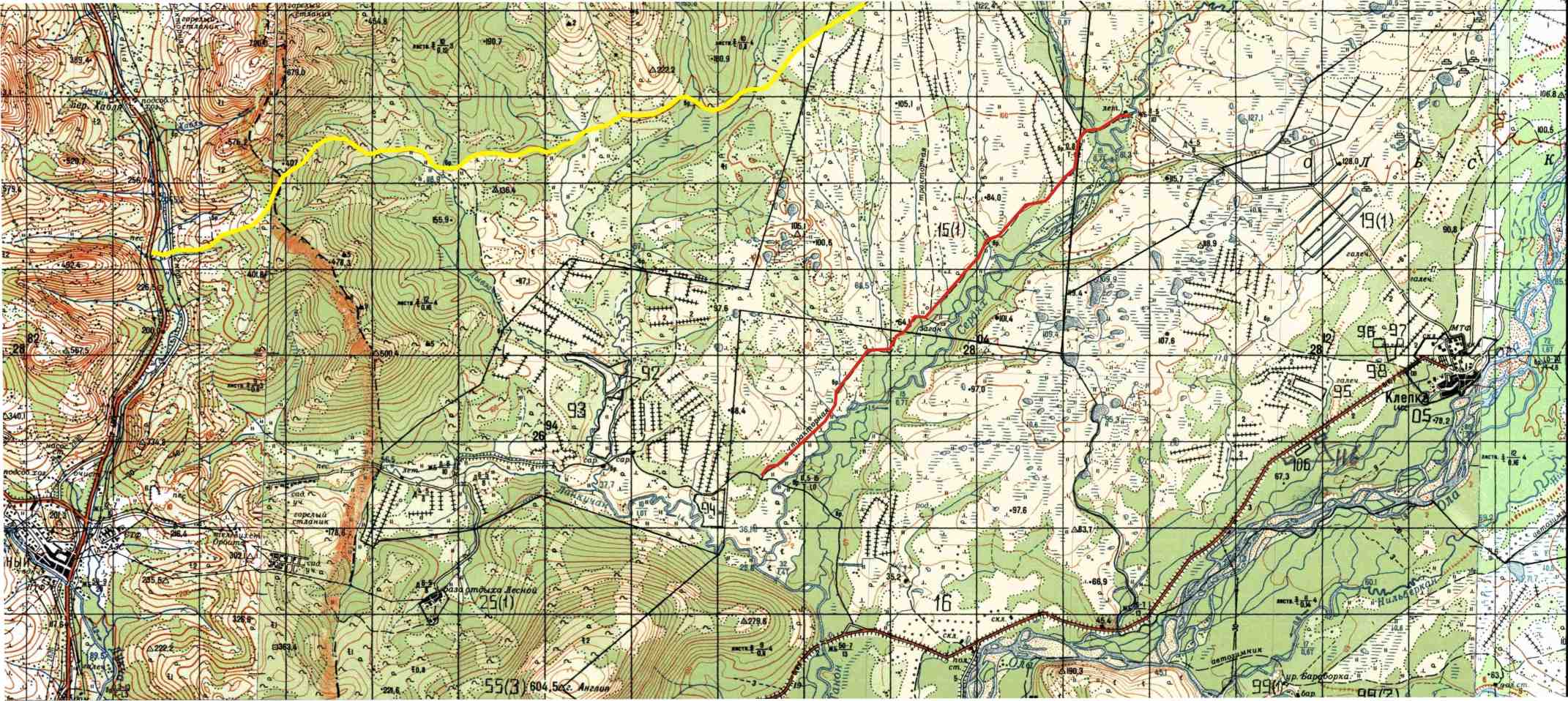 Там вроде если долго ехать можно на Клёпкинскую трассу выехать, никто не проезжал? Попробовать когда посуше станет (июль-август) никто не хочет? Если проехать вброд через Сердях нереально предлагаю следующий вариант - красная линия, до моста (на карте он есть). И вопрос кто знает про дорогу по желтой линии - это вроде как дорога на бывший карьер Сердях? PS за размер извините - меньше не читается. -------------------- Ρωσική Έλληνες δεν παραιτηθεί