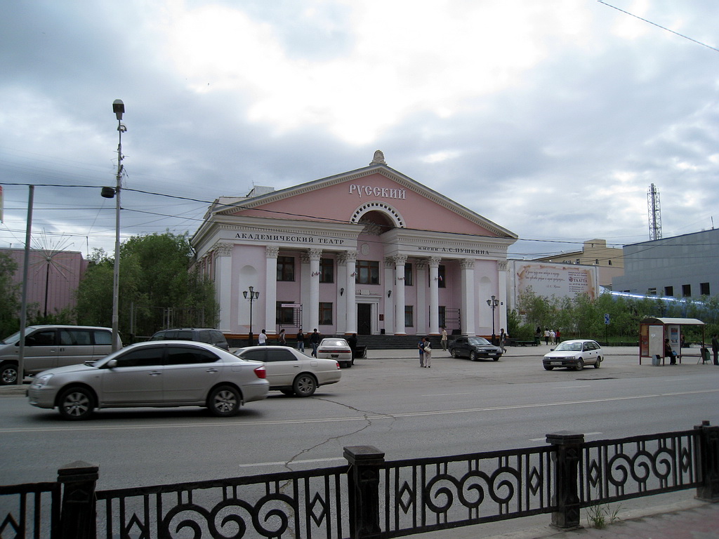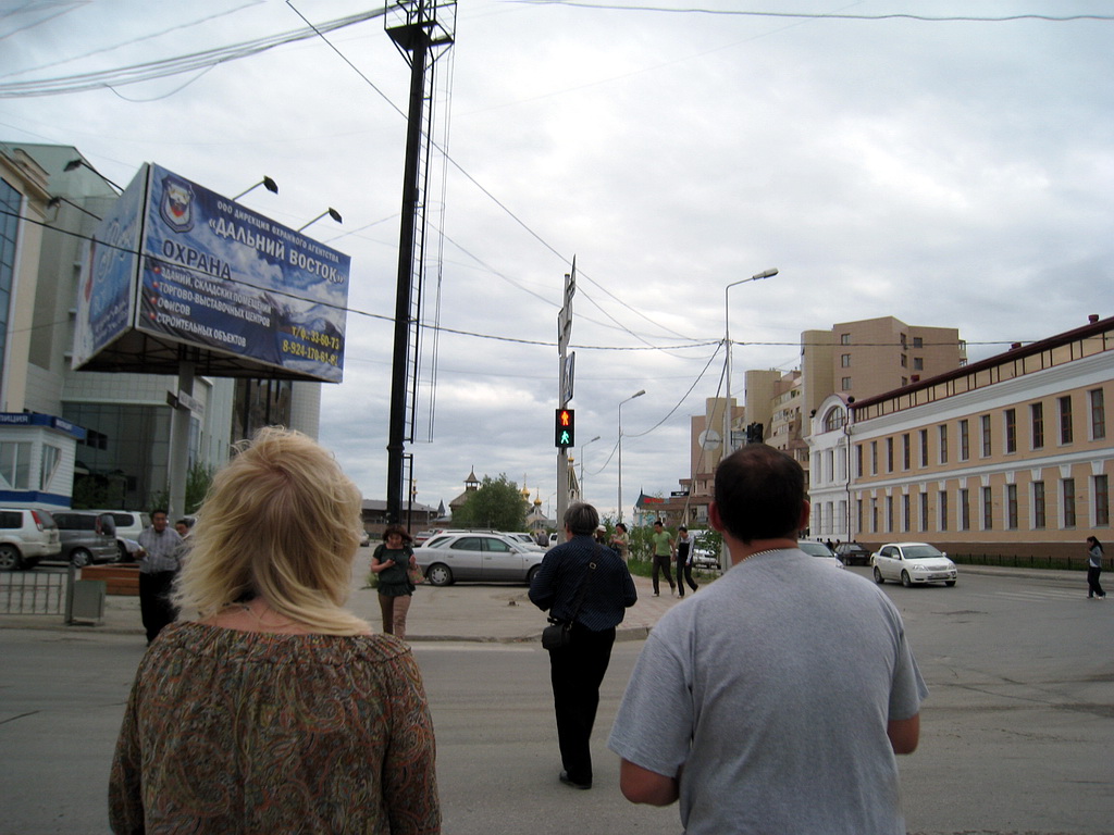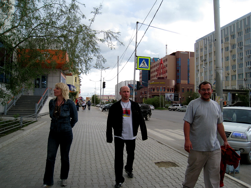 Утро началось не очень добро %)… Вчера порешили встать в 9 утра (по Якутску).. В семь утра стук в дверь – открываю, стоит абсолютно невыспавшийся Саша… «Вставай, говорит» - 9 утра уж.. Как 9 утра – ты на время смотрел?? По Якутску 7 утра. Оказывается – они забыли перевести часы.. Ладно, поспали два часа.. встали – попили кофе… Позвонили Валере, уточнили, откуда начинать поиски.. В Якутске есть улица – там сосредоточены всякие автомобильные разборки, магазины, рынки.. поехали туда, начали расспрашивать – ни у кого нет суппорта. Как оказалось - Сафарь – редкая машина для Якутска (конечно, это же не Уазик)…. Увидили остановившийся сафарь – подошли к хозяину – смешливый такой огромного роста якут, спросили у него – где типа можно поискать – он говорит да я сам на трех езжу… но типа вот вам газета – там частные объявления… позвонили –один телефон не отвечал – у второго – продается мост полностью в сборе… Ладно думаю – попробуем найти СТО с токарем – что бы выточил палец- оторый обломило. Начали искать по газете – нашли одно – но токарь у них в отпуске. Что же делать? Покумекали и решили – снимать суппорт – глушить дырку от шланга – что бы тормозуха не вытекала… Решено – сделано. Берем Сафаря, едем в СТО, которое звонили… По городу на сафаре ехал осторожно – Якутск – достаточно большой город – машин много.. а у меня сафарь толком не тормозит, очень сложно, короче.. Начали искать СТО… и выехали на окраину – которая находиться в километре от центра.. мать моя женщина – покосившиеся халупы, полное безлюдье на улицах.. в общем такое чувство, что заехали в брошенный поселок… дорога – жуткий грунт весь в колдобинах, лужи, собаки в пыли.. типичная деревня.. кое как выбрались – поймали аборигена (потом по рации – лови аборигена – стало кодовой фразой, для того что бы расспросить когонить о дороге).. кое как нам объяснили куда ехать.. Приехали на СТО, заглушили суппорт – решили помыть машины. Еще раз позвонили Валере, спросили про мойку. Валера тоже решил помыть автомобиль – потому договрились встретиться. Встретились поехали… Что сказать про самочувствие сафаря после ампутации тормозной лапки? Торомзит так же в принципе – но на асфальте – не надо резко тормозить педалью в пол, потому как может теоретически занести. Поехали мыться. Дороги в Якутске – не всегда сделанные.. но центральные улицы, бульвары вполне в нормлаьном состоянии.. Бульвар это такая дорога по три полосы каждые стороны у которой разделительной полосой является газон.. либо трамвайные пути.. Трамвайных путей в Якутске нет, так же как и трамваев. Короче первый раз в большом городе ездил за рулем.. но вроде никого не подрезал, никто на меня особо за нарушение не обиделся… да я особо и не нарушал. Помылись.. кстати шампунь на мойке был гламурно – розового цвета и мойка дешевле чем в Магадане – 400 рублей за джипа, нашли банкомат, сняли денег, поблагодарили Валеру, расстались по дружески. По дороге в гостиницу попали в пробку – на соседней полосе возле меня остановился якут на ноахе – предложил мне поменяться с ним машинами – я отказался, тогда он предложил с его доплатой поменяться – я опять отказался – посмеялись – разъехались. И поехали в гостиницу. Выезжать естественно поздно уже.. Поэтому решили оставить машины в гостинице, а самим пойти погулять. Гостиница относительно в центре.. поэ