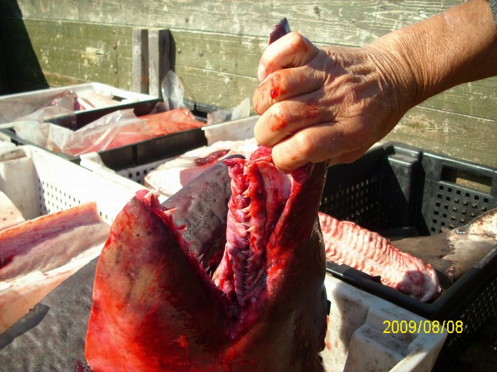 Вес говорили 300 Кг, не успели на целую попасть, поглядели только на разделанную тушу, размеры впечатлили. Акулу то поймали, но сетке кранты