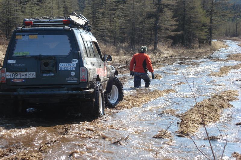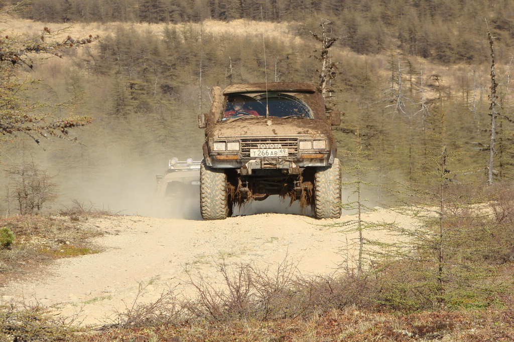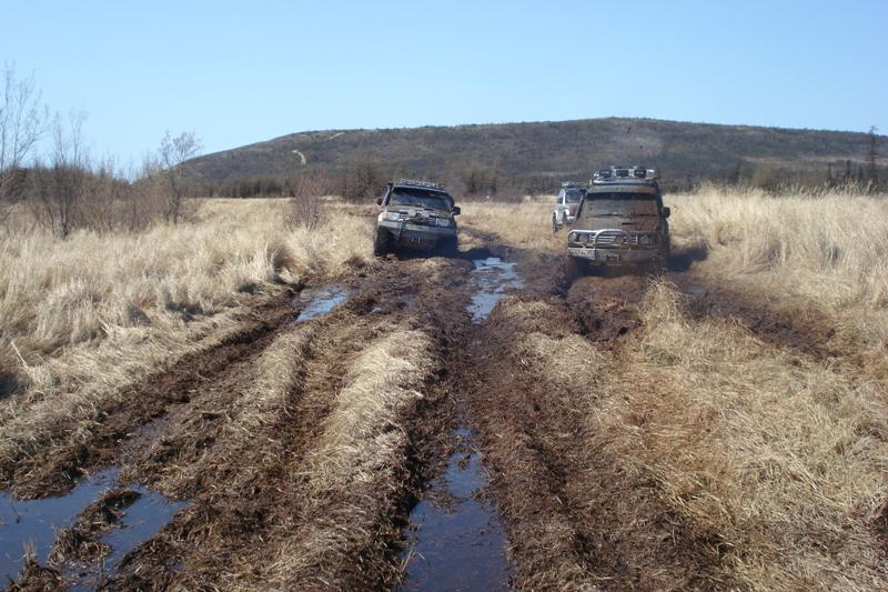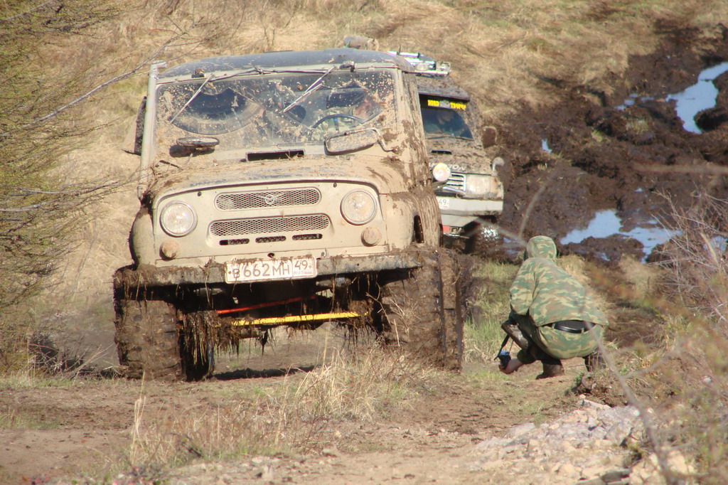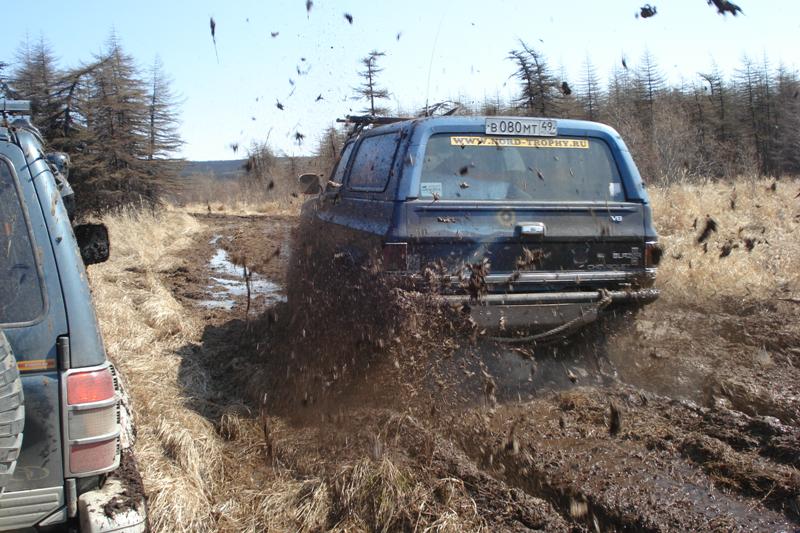 30 мая, в 8 утра все, проезжающие через 4-м км основной трассы, стали невольными свидетелями странного скопища странных автомобилей. Огромные колеса, железные бампера, вырезанные арки, лебедки... То были: "Механизм" Эстонца, "ЗИЛ" Дюйма, УАЗ на 36-м "Боггере", 3 практически одинаковой комлектации 3-дверных "Паджериков", среди которых был и наш старый товарищ Pajero959. В прикрытии шли 2 тяжелых крейсера Тойота Ленд Круз 60. Кто-то из проезжающих сигналил, за что был достаточно далеко послан Эстонцем с крыши свеого "Механизма", где мастырил боевое знамя клуба Норд-Трофи! Как и водится у нас с Дюймом, последние ночи перед трофи провели в подготовке. Рессоры встали на свое штатное место буквально за 6 часов до выезда! Но мы таки выехали и даже почти не опоздали К 13-му километру все же собираемся вместе. Флагмана с боевым знаменем пропускаем вперед. Идем в колонне. Пост. Молчание. Барабанная дробь.... Идет.... Остановил... бля. "здравствуйте, куда едете? На Чистое?" - "не, на Ланковую собрались" - "ааа, понятно, а если я вас всех попрошу мне права показать?" - "Не, не дадим, все равно нету ни у кого" - "ну тогда езжайте" Дальше было проще. Блейзеру раздолье - новые рессоры на удивление мягко работали, никаких "прилетаний" моста, никакого грохота сзади. Газу и полетели Собрались только на ольских поляк. Замки в боевое положение. Резину - спускаем. Люки задраены, лебедка к бою готова, связь настроена... Нас опережают. Пырзики (так уж прозвали все компанию из 3-х Паджериков) ныряют в грязь. Первый, второй, третий.... потоки грязи заставляют нас, наблюдающим за преодолением первой грязи, отходить все дальше и дальше назад. Как поехал "Механизм" смотреть было не очень интересно - побрякивая, пощелкивая, позвания, постукивая и довольно фыркая УАЗка ползла через лужи, грязь так, будто ползал по своему двору. Неотъемлемая часть "Механизма" - Эстонец, наполовину высунув довольную морду из лица дополнял картину всепроходности мегажелезки. "Шестидесятки", словно линкоры, покоряющие штормовые волны, рыча моторами и нагоняя страх на лесных жителей, планомерно, но уверенно (ну не совсем уверенно, но двигались) вперед, уничтожая своими колесами весь ландшафт местности, грязи, трава летели на 10-ки метров! Наступила очередь "Блейзера", мерно рыча мотором медленно окунаем колеса в грязь. Так же медленно из неё выезжаем. Никакой пробуксовки, без шлифовки. Восторг на лице у Дюйма! Едем...Пырзики едут с переменным успехом. В итоге встают в кильватер "Зилу"... едем впереди, как утят ведем их. Выбираем дорогу. Все было замечательно, пока Дюйм не увлекся и не пошел ещё раз радоваться новым колесикам в очередную засадную лужу.. Пырзики отстали надолго На правом траверсе идет "Механизм", на очередной горке нестественно резко тормознулся. "П*да УАЗке" - первоочередной диагноз поставил Эстонец по рации. Потом было вытягивание его из ловушки лебедкой, перетаскивание к близлежайшему жилищу местных то ли охотников, то ли рыбаков. Перегрузили шмудряк, рассадили по машинам. Поехали дальше. К этому моменту Пырзики и 60-ки уже поняли, что нужно для их машин, едут довольно таки сносно. Эстонец принял на себя командование вторым УАЗом. Итог - х8й догнали их... Связываемся со второй группой, ожидающей нас далее. У них уже весело. Пока не забыл. У меня тут просьба для всех: Не смейте говорить ничего обидного Дюйму, типа его машина "тормо