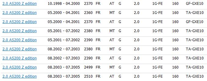 2.0 AS200 Z edition 05.2001 - 07.2002 2380 FR MT G 2,0 1G-FE 160 TA-GXE10 2.0 AS200 Z edition 08.2003 - 07.2005 2510 FR AT G 2,0 1G-FE 160 TA-GXE10 2.0 AS200 Z edition 08.2003 - 07.2005 2499 FR MT G 2,0 1G-FE 160 TA-GXE10 2.0 AS200 Z edition 08.2002 - 07.2003 2390 FR AT G 2,0 1G-FE 160 TA-GXE10 2.0 AS200 Z edition 05.2001 - 07.2002 2390 FR AT G 2,0 1G-FE 160 TA-GXE10 2.0 AS200 Z edition 05.2000 - 04.2001 2370 FR AT G 2,0 1G-FE 160 GF-GXE10 2.0 AS200 Z edition 05.2000 - 04.2001 2360 FR MT G 2,0 1G-FE 160 TA-GXE10 2.0 AS200 Z edition 10.1998 - 04.2000 2370 FR AT G 2,0 1G-FE 160 GF-GXE10 2.0 AS200 Z edition 08.2002 - 07.2003 2380 FR MT G 2,0 1G-FE 160 TA-GXE10 -------------------- |