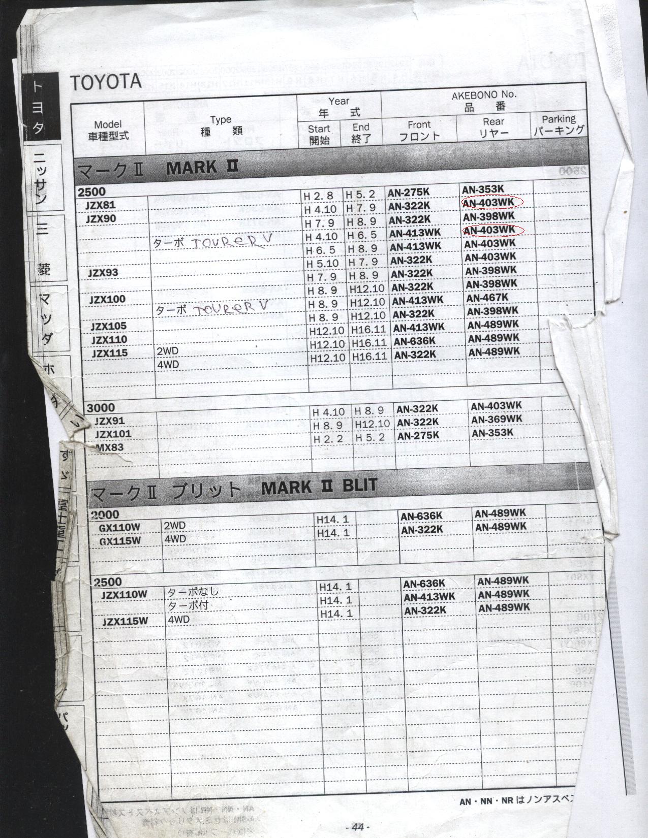 вот чтобы вопрос отпал... Цитата Код детали Кол-во Период выпуска Дополнительная информация дисковый тормоз 42431-22170 02 09/1996 - 06/2001 JZX100..TOUV дисковый тормоз 42431-22180 02 09/1996 - 06/2001 GX105,JZX10#..AVT,AVTG,TOUS Суппорт тормозной 47730-22340 01 09/1996 - 06/2001 JZX100..TOUV Суппорт тормозной 47730-30351 01 09/1996 - 06/2001 GX105,JZX10#..AVT,AVTG,TOUS ЦыфрыЧ, и на 90турВЭ и обычном 2.5 тоже есть разница... проверял лично... Сообщение отредактировал qweqweqwe - 11.2.2010, 19:13 -------------------- 2jz sengle turbo