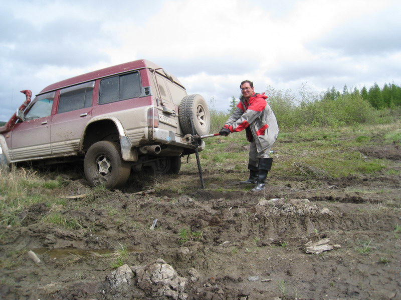 первый раз из за резины - замылилась и не хотела вывозить (пля придется резину опять новую брать)... в первом случае спас хайджек... во втором лебеда и валяющийся рядом трос (штатной лебедки до дерева не хватило ((()... все таки классный девайс.... (правда перестал опускаться нормально).... зато поднимает супер... итог поездки - пройдено 625 км, поетрен один брызговик где то в глине (если местные найдут - то вернут.. я там уже пользуюсь популярностью оказывается)..... помято немного крыло хайджеком... (соскочил скотина) об глину разбиты два фендера. не в хлам.. но болтаются.... потерена штатная защита движки.. Резина - это 90% успеха! Если у тебя экспедиционная машина, то присмотрись к PRO COMP. Они и гарантию дают самую большую по пробегу. Для удлинения троса лебёдки возьми дополнительно кевларовый трос. Прочно, надежно, занимает мало места и весит гораздо меньше металического. Что бы Хай-Джек зароботал нормально, промой его и смаж маслом (хотябы штифты и рельсу). Начнет работать как новый. У них это не болезнь, а скорее закономерность конструкции. Грязь, песок и вода - делют свое дело. Хай-Джек в крыло - проходили)) Нужна нормальная опора и постоянное придереживание. Ну а вобщем, ещё пару -тройку подобных поездок и, думаю, увижу тебя на большой резине с лифтом и всеми остальными девайсами, примечательными для Трофийных авто))) -------------------- Главное в экстремальном отдыхе-вовремя заметить, когда заканчивается экстрим и начинается полная Ж@па!