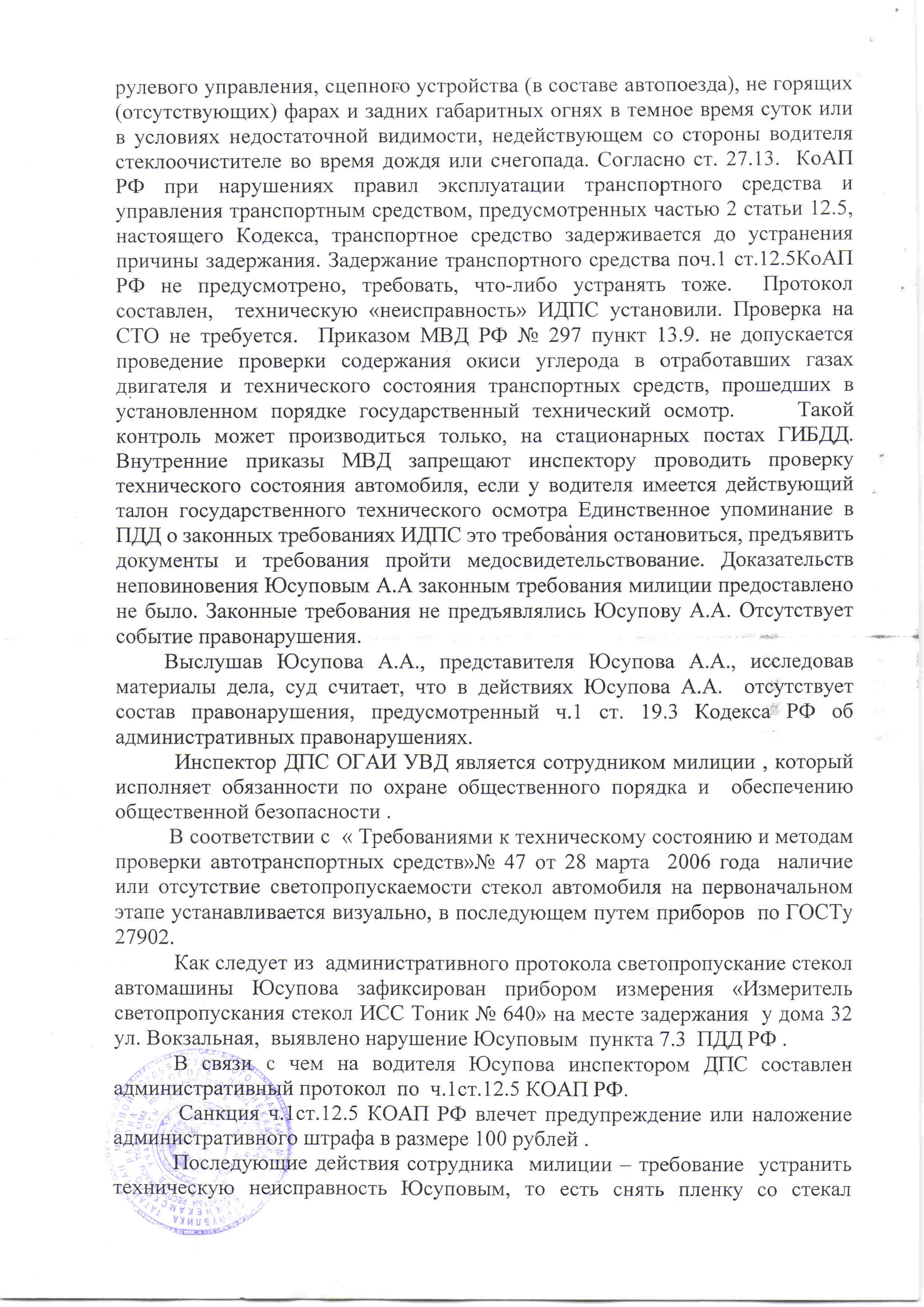 Остановка вне стационарного поста.Примерное заявление в прокуратуру (с различными вариантами) В прокуратуру г.Магадан ул. __________________________________ От:___________________(ФИО полностью) Проживающего по адресу:______________ Жалоба на неправомерные действия инспектора ДПС "___"_______20__г. я управляя автомобилем ________________________ ГРН _____________________ двигался по ул. _________________ направляясь со стороны ул. ____________________________ в сторону ____________________________. Меня остановил инспектор ДПС ___________________________________. -Предъявить свое служебное удостоверение инспектор отказался. Его фамилию я позже узнал из составленного им протокола. -Далее инспектор, сославшись на визуальное определение наличия на стеклах автомобиля тонировочной пленки, произвел замеры светопропускаемости передних боковых стекол прибором ___________________________ и составил протокол об АПН №_______ от "___"______________ 20__ г. -На мою просьбу предъявить мне сертификат поверки и паспорт прибора которым пользовался инспектор для измерения светопропускаемости инспектор мне отказал. -Я просил инспектора предоставить мне возможность воспользоваться услугами адвоката. Инспектор мне в этом отказал и заявил, что по таким делам адвокат не требуется. Тем самым нарушил мои права по ст. 48 Конституции РФ и ст. 25.5 КоАП РФ. -Я попросил инспектора вписать в протокол данные моего пассажира в качестве свидетеля, но он отказал мне сказав, что это заинтересованное лицо и вписывать его он не станет. Считаю данные действия незаконными. Понятие свидетель предусмотренное ст. 25.6 КоАП РФ допускает пассажира в качестве свидетеля. -Мои права и обязанности предусмотренные ст. 25.1 КоАП РФ инспектором мне разъяснены не были. Тем самым инспектор нарушил ст. 114 приказа МВД "185. -На протяжении всего времени общения с инспекторам, инспектор вел себя по отношению ко мне агрессивно, оказывал на меня психологическое давление. Тем самым он нарушил требование статьи 19 приказа МВД 185.-Контроль светопропускаемости стекол производился вне стационарного поста ДПС, что противоречит требованиям приказа 1240 МВД РФ.-Инспектор не является инспектором технического надзора ГиБДД и согласно приказу 1240 МВД РФ не имеет полномочий проводить замер светопропускаемости.-Замер светопропускаемости производился на грязных (мокрых) стеклах. -На датчике прибора мной была обнаружена нанесенная затемняющая пленка. -При замере светопропускания не присутствовали понятые. -Составленный инспектором протокол, на основании всего вышеизложенного, считаю незаконным и необоснованным. Учитывая вышеизложенное прошу: 1. Прекратить административное дело по протоколу об АПН №_______ от "___"______________ 20__ г. 2. Наложить дисциплинарное взыскание на инспектора ДПС _________________________________ 3. Рассмотреть данную жалобу в мое отсутствие. 4. Ответить мне письменно в установленные сроки, по существу вышеизложенного, по месту моего жительства. 5. Ответ на данную жалобу отправить за личной подписью прокурора ___________________ района. "___"___________________20__ года. ______________________/ФИО. Приложение: 1. Копия протокола 2. свидетельские показания на ___ листах. Если инспектор угрожал сдиранием пленки, изъятием талона ТО или штрафстоянкой, то указываем это и просим возбудить административное дело в отношении инспектора по статье 19.1 КоАП РФ "Самоуправство". Боритесь с беспределом на дорогах, как со стороны водителей, так и со стороны иДПС!!!