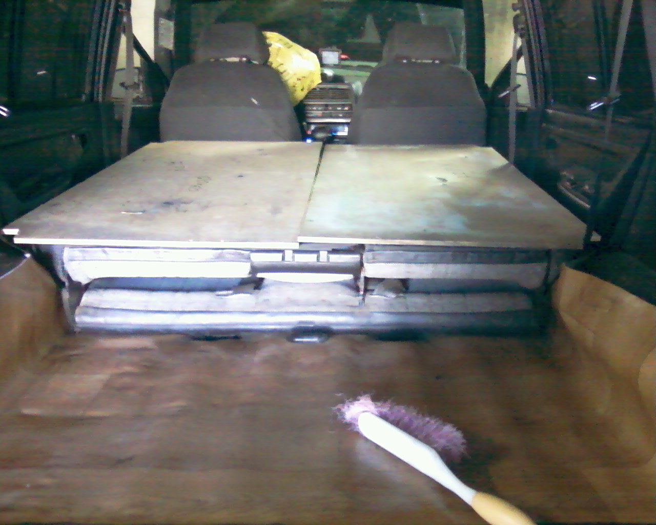Так как регулярно приходится выезжать за пределы города (рыбалка, охота и.д.) и ночевать в машине, решил я сделать спальное место в своем авто, т.к. на сиденьях спать не очень удобно (при этом задние сиденья снял вообще). Вообщем сварил рамку из трубы профильной 20Х20, покрасил, прекрепил к кузову (чтоб не прыгала) сверху сделал настил из фанеры (10 мм). Насил сделан из двух частей: 1-я часть прикреплена шурупами у металической рамке, а вторая часть ложится сверху. При необходимости ночлега, вторая часть настила устанавливается между рамкой и креслами авто (заранее отодвинутыми до упора вперед и сложенных также вперед). Таким образом получаем спальное место в полный рост. Обшиваем для эффекта фанеру тканью (я обшил кавролином прорезиненным) и усе. При этом имеем нижне отделение для хранения инструмента, и т.д. Кстате сидя ехать при сложенной конструкции также можно.